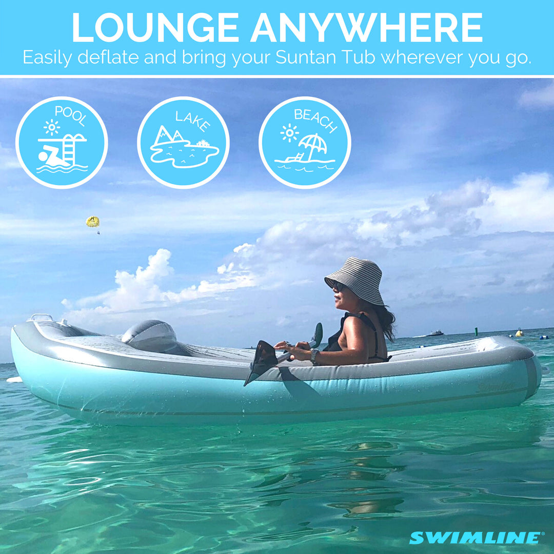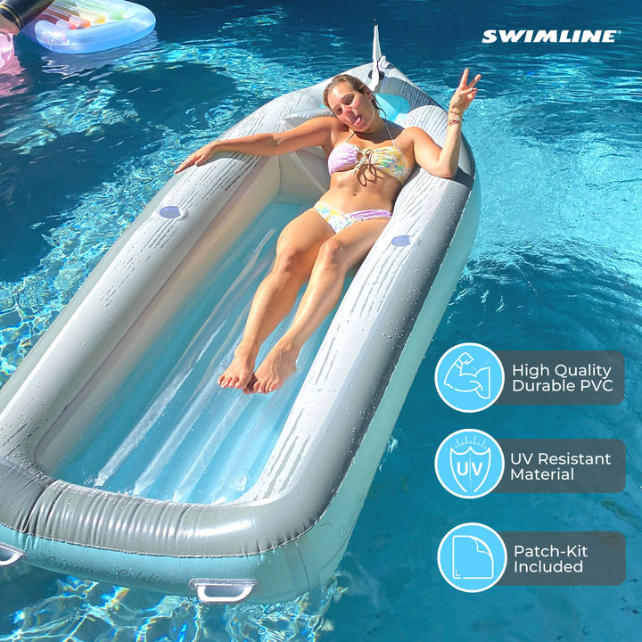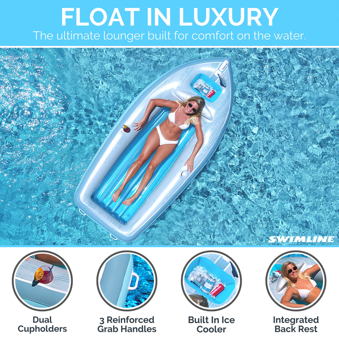 - Enjoy a relaxing day in the pool with the Swimline Inflatable Boat Pool Float with picnic boat design