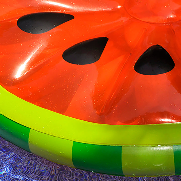 Life is sweet, and so is the summertime, so spend those hot days chilling on a cold slice of watermelon. Measuring 60 inches in diameter, this raft offers space for 1 person to stretch out. Made of durable PVC vinyl materials, you'll enjoy this water raft for years of poolside fun. Whether you're splashing in your backyard swimming pool or floating down the lazy river, this colorful round inflatable is exactly what you need. Easily inflate this watermelon raft with the use of an air pump (not included) or deflate when not in use for a convenient storage solution.