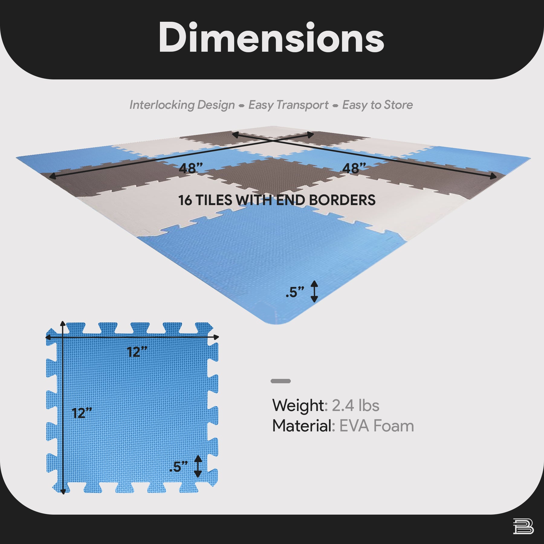 • Featured color scheme of blue, brown, and beige, this interlocking mat pack covers up to 16 square feet of play space, with each tile measuring 1 square foot