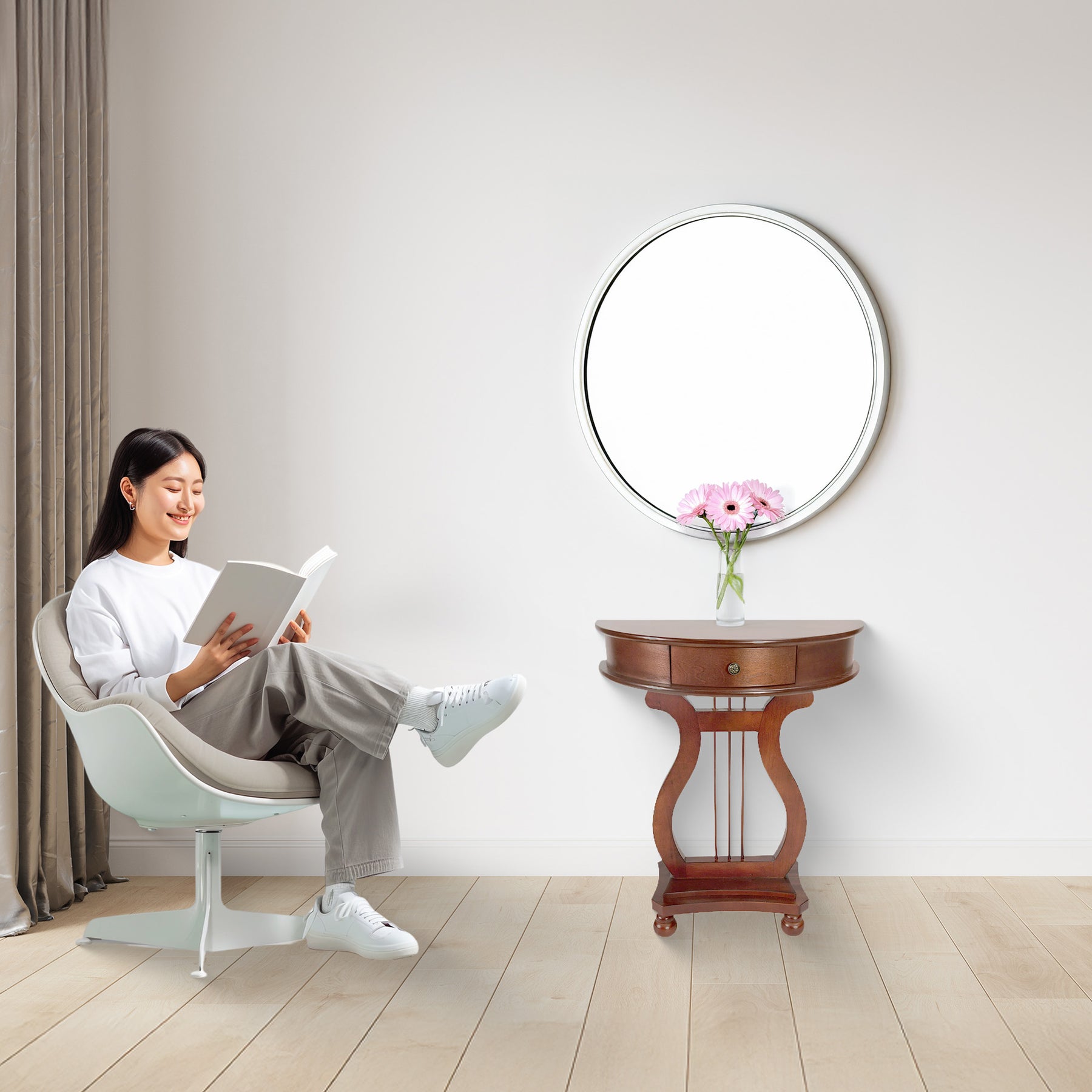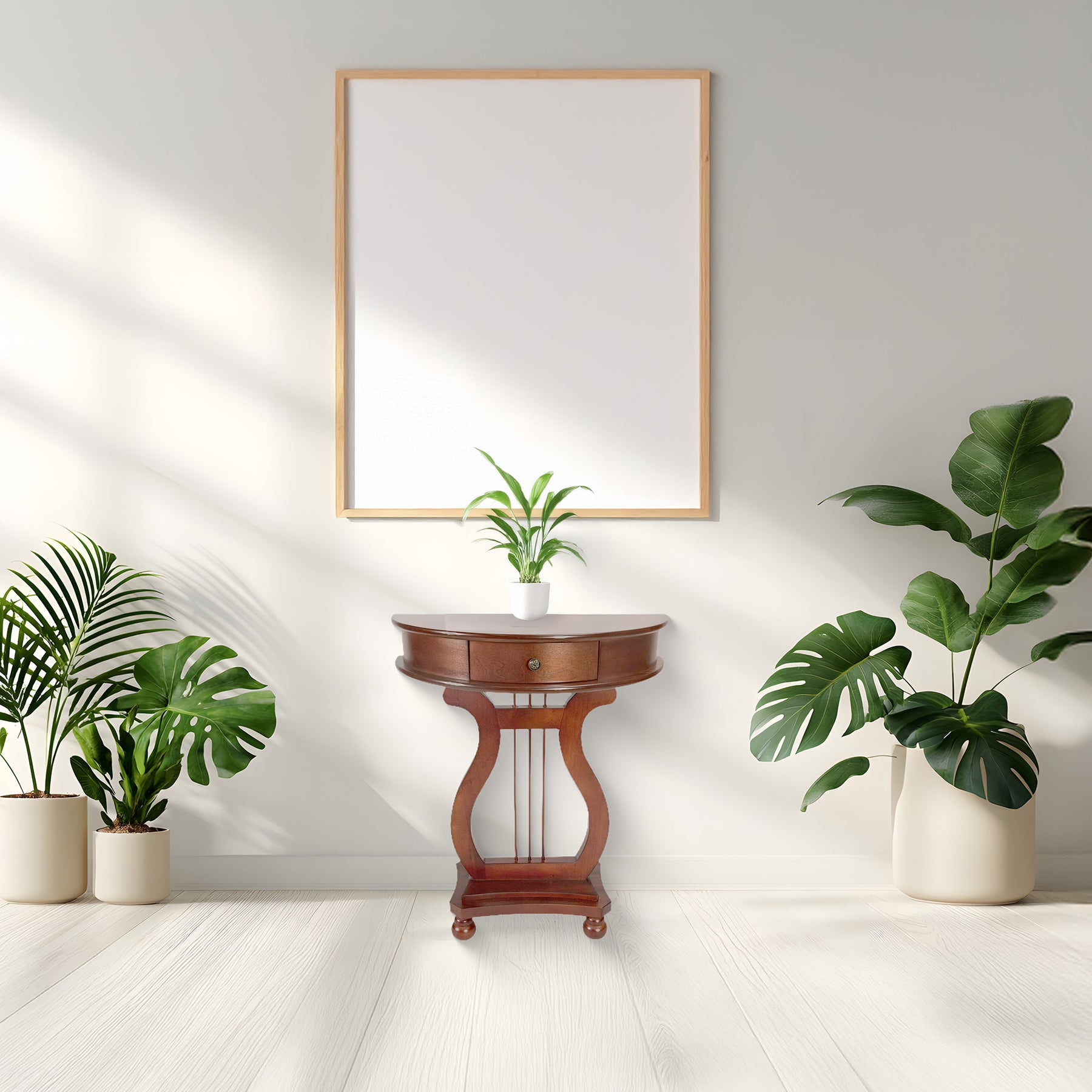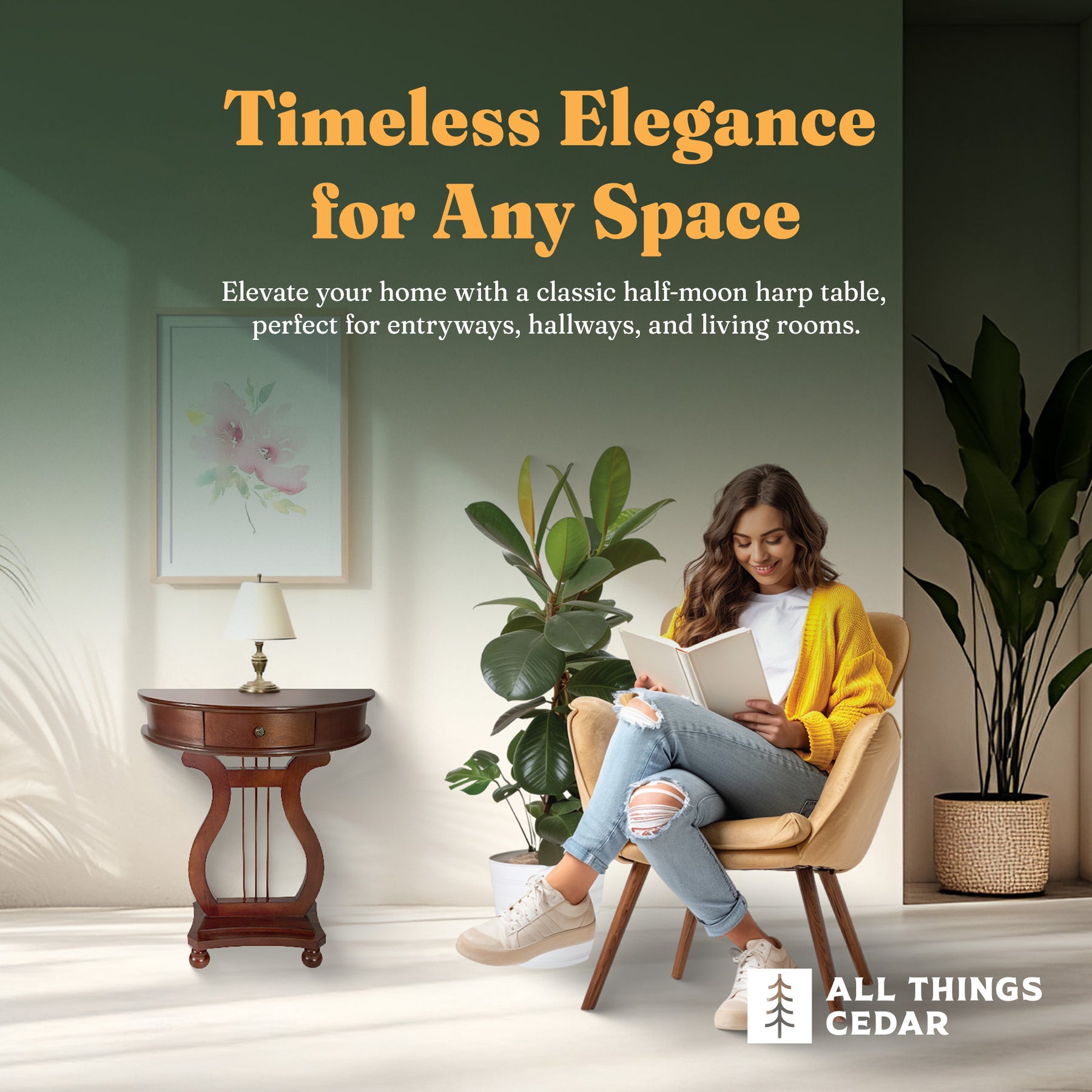 • Elevate your entryway, hallway, or living space with the classic charm of the All Things Cedar Half Moon Harp Console Table's stunning natural-colored veneer
