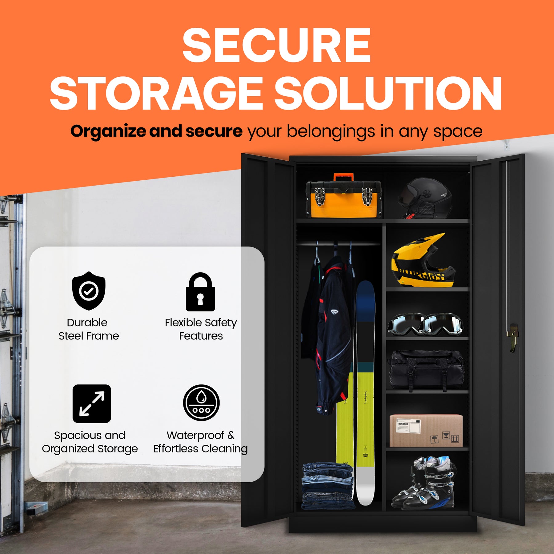 • 72-inch steel wardrobe style storage cabinet with 3 adjustable shelves and a cloth rail is suitable for storing clothes, towels, and beddings