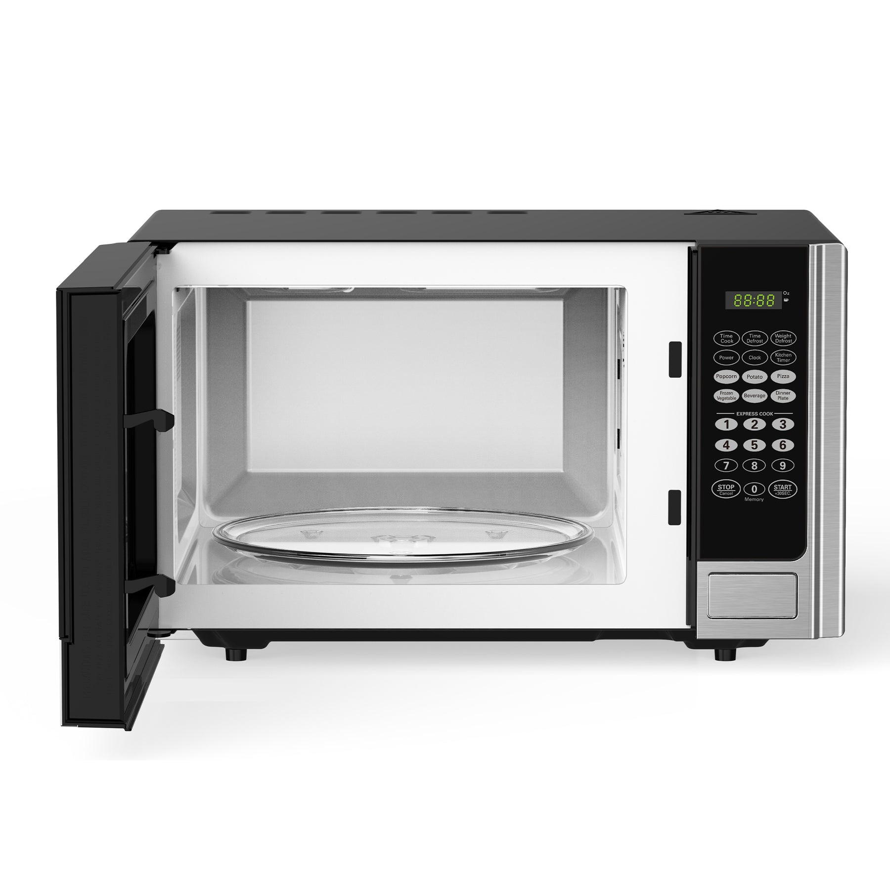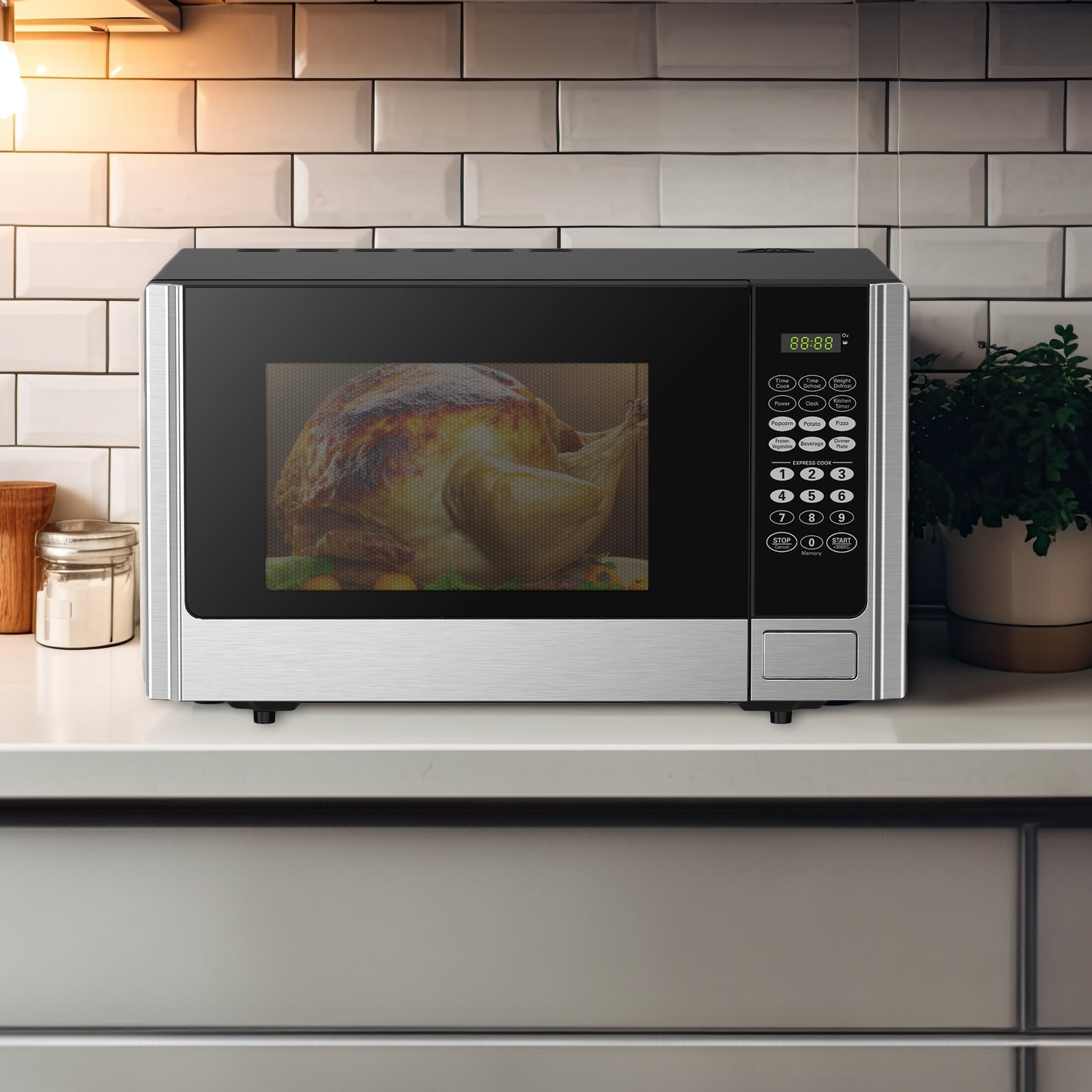 • 0.9 cubic foot countertop microwave oven with digital touch controls and choice of 6 pre-set cooking options