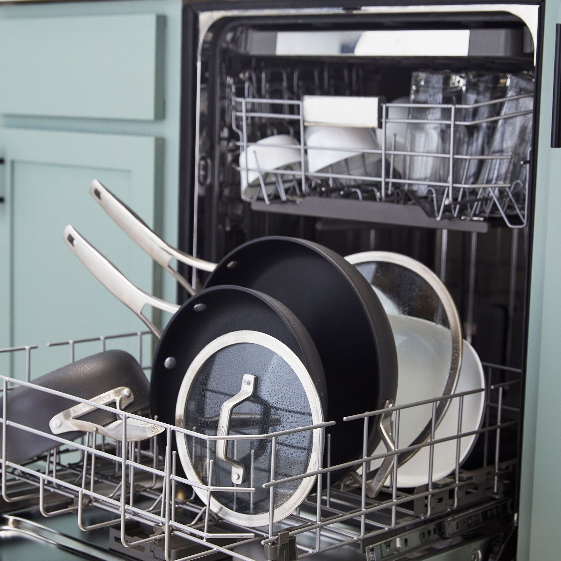 • Hard-anodized aluminum construction ensures even heating; dishwasher-safe exterior allows for effortless cleanup