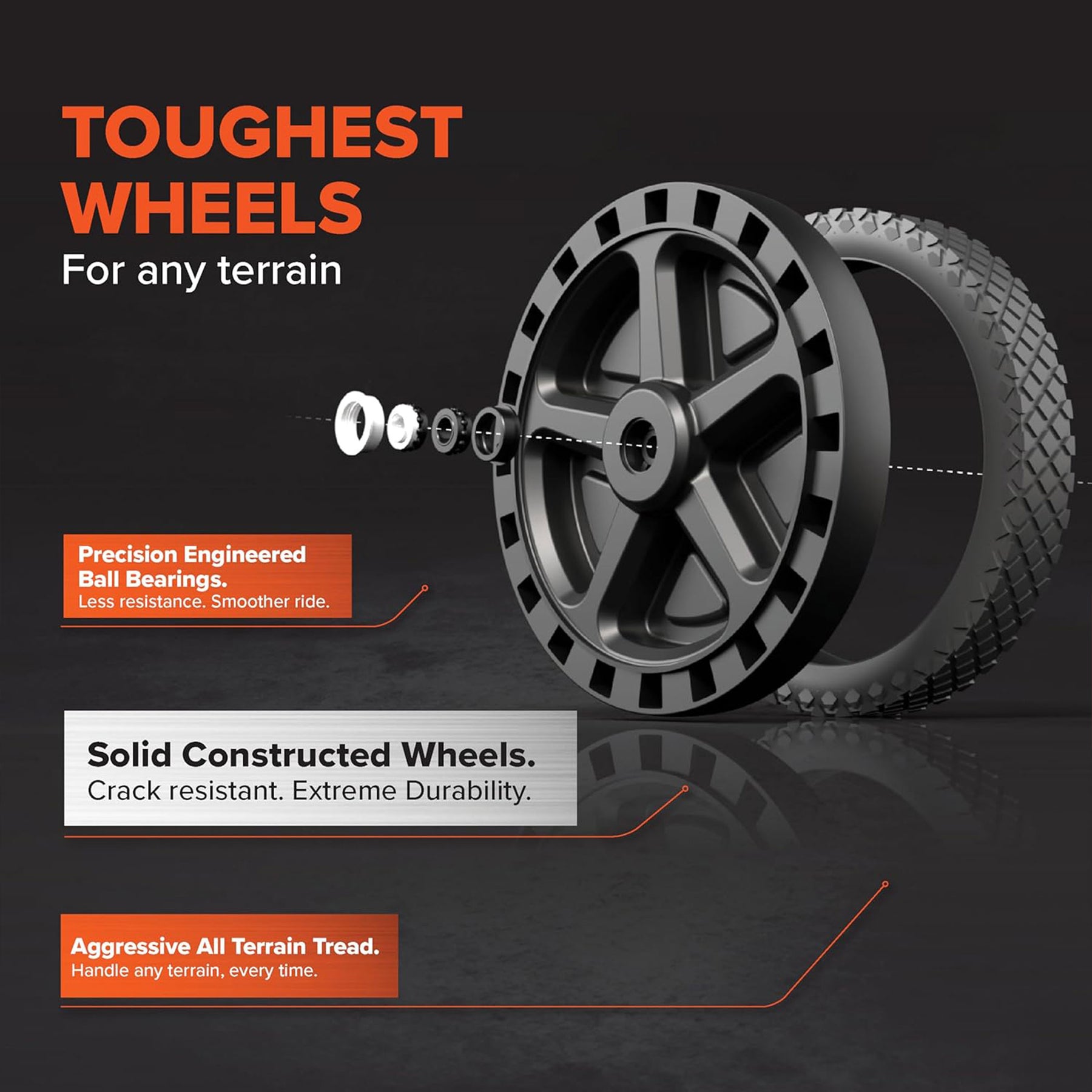 • Large, no-flat wheels make going over rough terrain easier