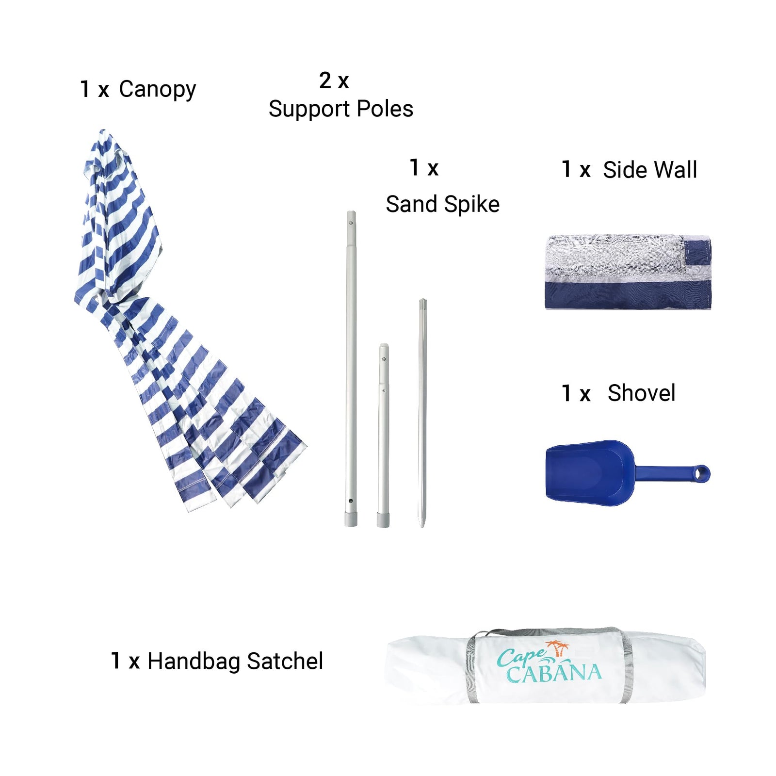 - Comes with canopy, sidewall, 2 support poles, sand spike, shovel, and cover bag