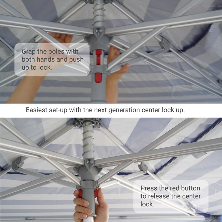 - Beach shade canopy features quick and easy installation with the next-generation center lock; Simply grab the poles, push up to lock, and push the red button to release