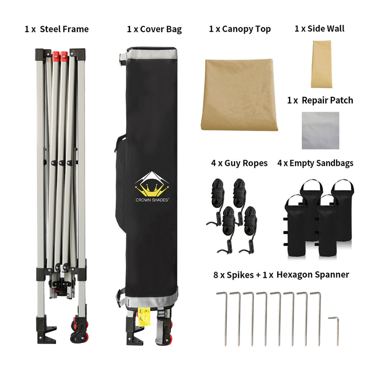 • Package includes frame, canopy top, sidewall, wheeled cover bag, repair patch, 4 guy ropes, 4 empty sandbags, 8 spikes, and 1 hexagon spanner