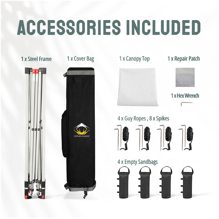 - Package includes frame, canopy top, cover bag, repair patch, 4 guy ropes, 4 empty sandbags, 8 spikes, and 1 hexagon spanner