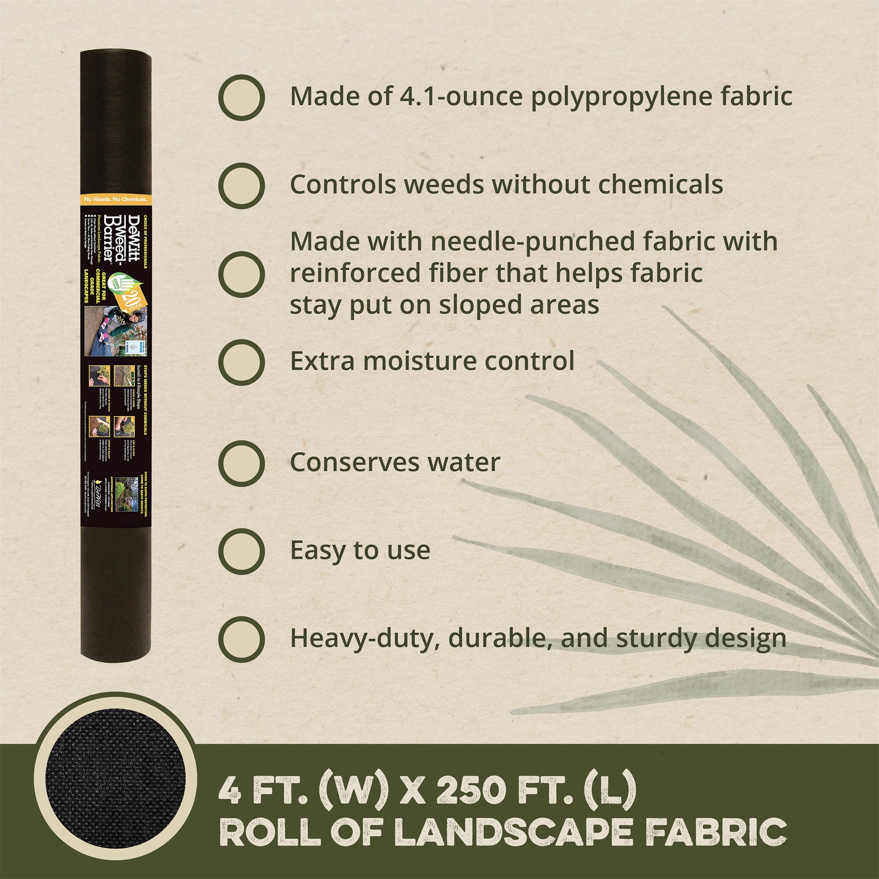 - Woven, polypropylene, needle-punched fabric with reinforced fiber for extra moisture control and helps the fabric stay put on sloped areas
