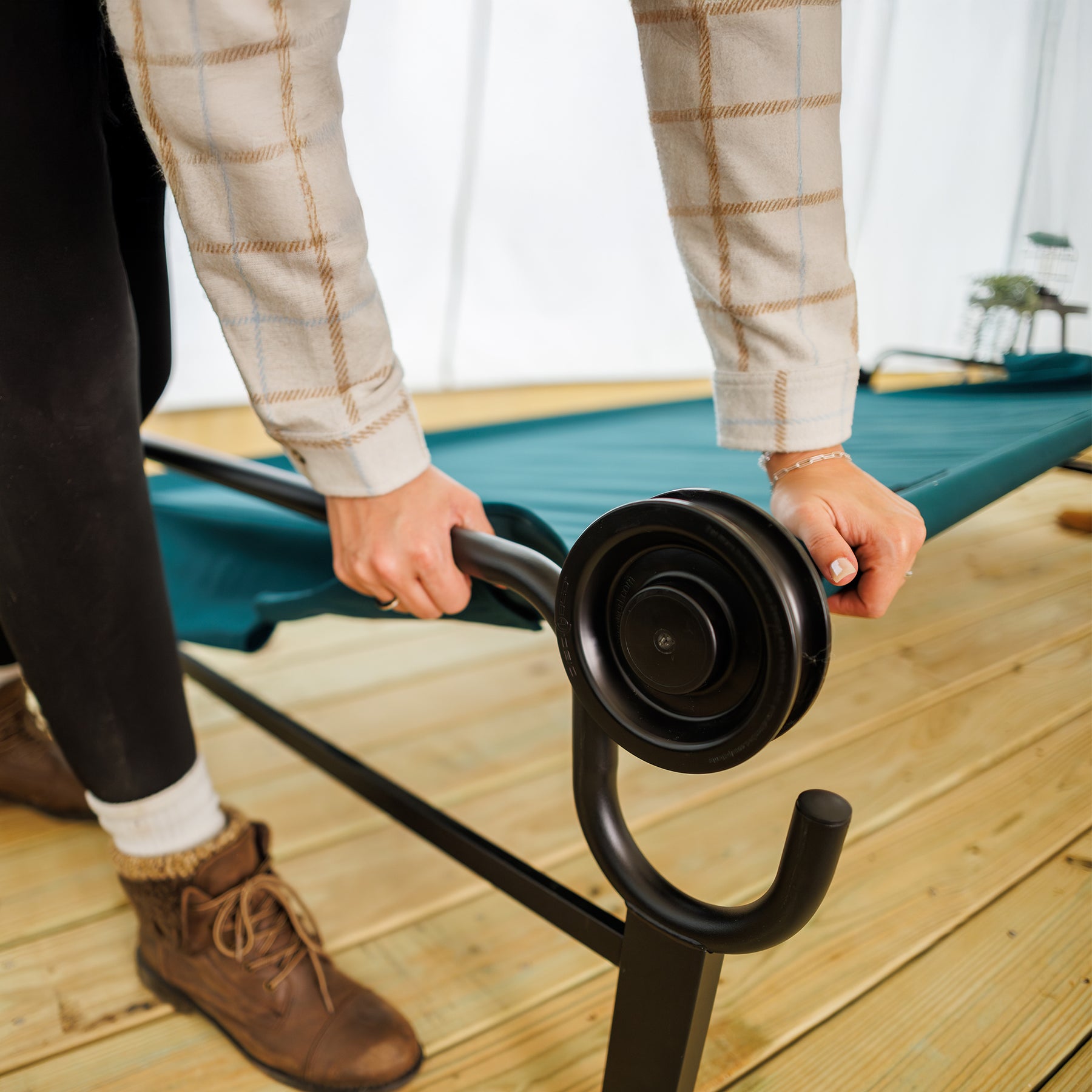 • Cot equipped with a high-grade polyester sleeping deck that provides contoured comfort without the need for a mattress
