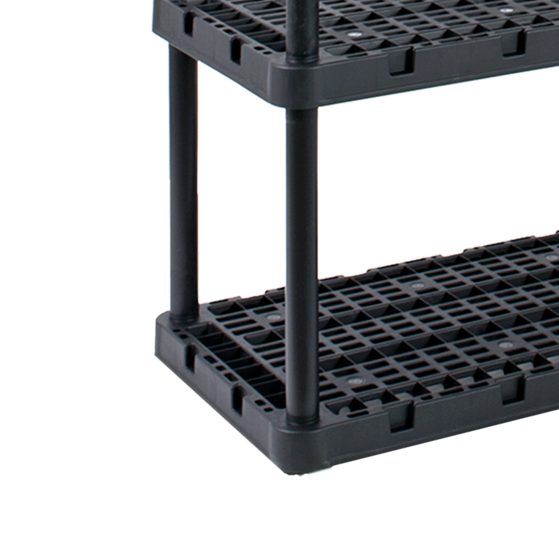 With its simple, no-tool setup, lightweight body, and black coloring, you can easily make this storage unit work in any room of the house. Easily snap all the included parts of this multi-purpose unit together for a simple, no-stress installation process. Plus, with the Knect-A-Shelf feature, you can interconnect multiple units from any side for added storage space (additional units sold separately). Constructed of durable and lightweight materials, the storage possibilities are endless. Each shelf is ventilated and made to support up to 150 pounds and up to 600 pounds overall, allowing you to organize seasonal clothing items, home decor, toys, supply crafts, and other tools or accessories. Make sure that you distribute the weight evenly on the fixed shelves. This organizing shelf offers an ideal height for both kids and adults and is a great addition to any home or office space.