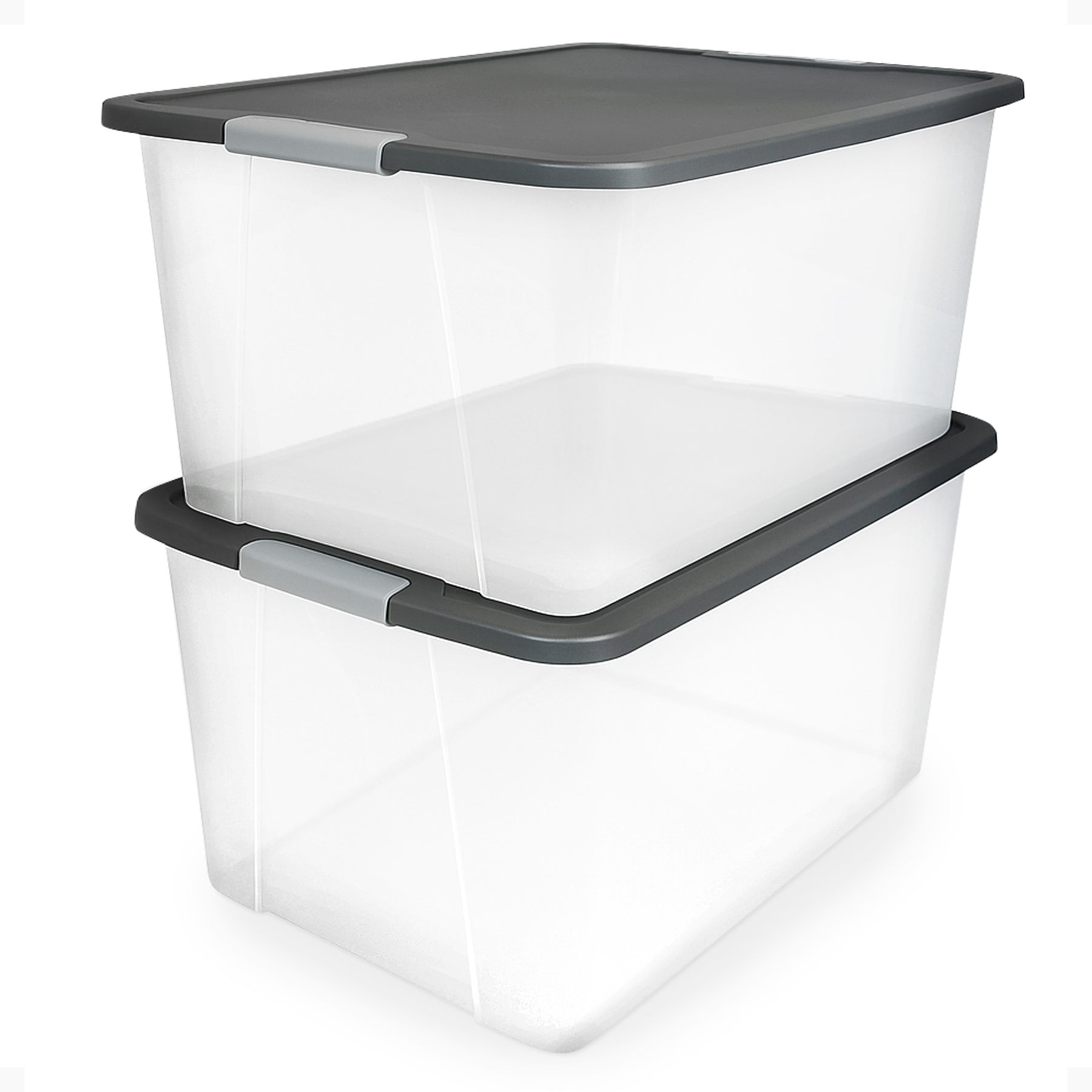• Contain your chaos with this set of (2) 64-quart clear storage totes ideal for clothing, office supplies, personal items, and more