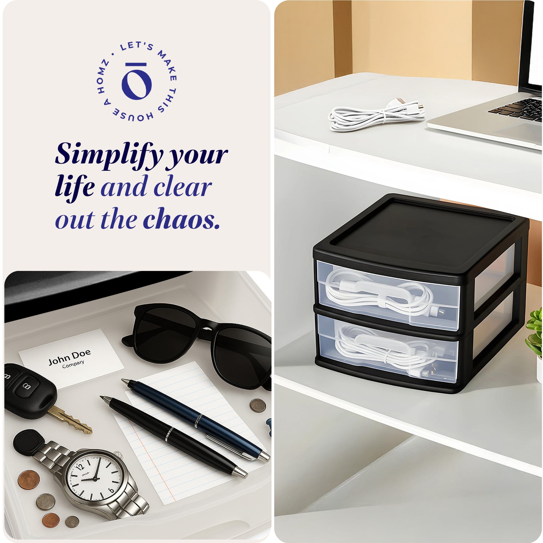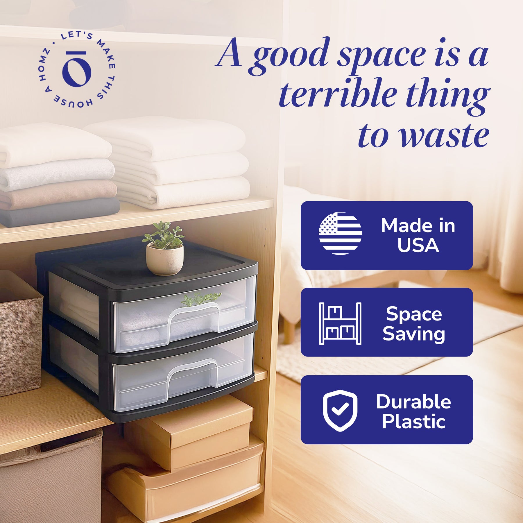 Homz Plastic 2 Drawer Medium Storage Cart, Black Frame with Clear Drawer, 2 Pack