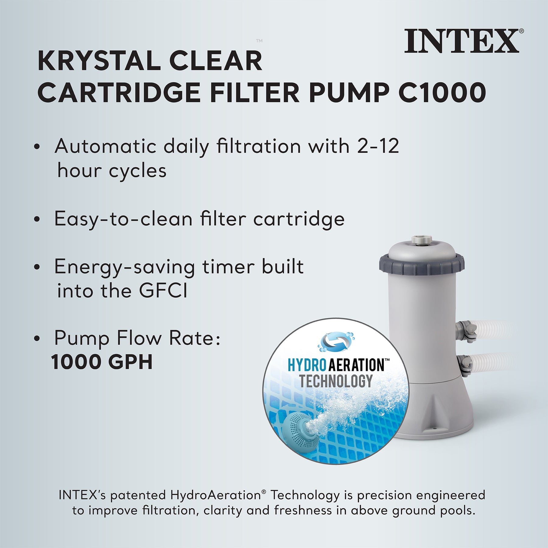 • 110-120V cartridge filter pump with a pump flow rate of 1,000 gallons per hour