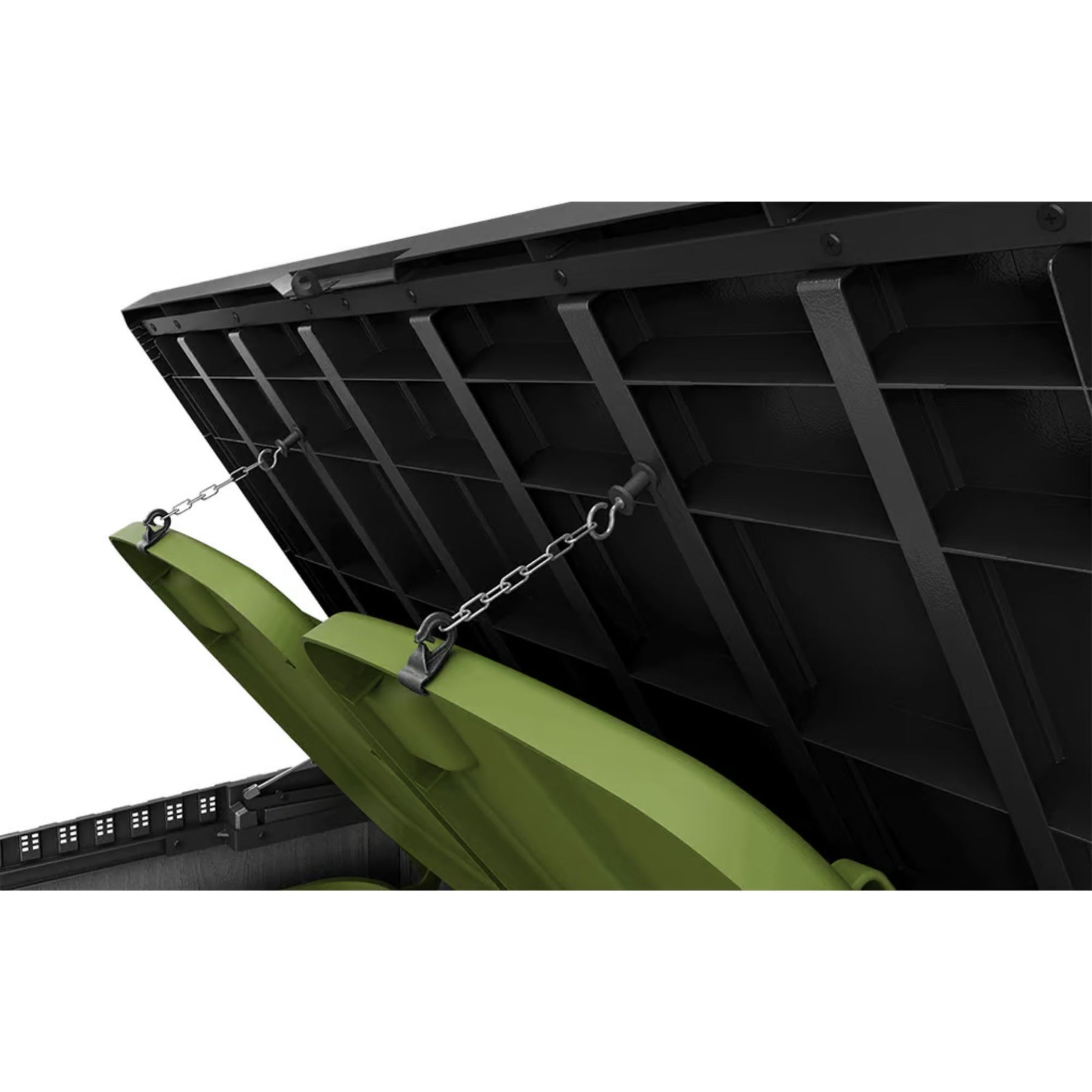 • Holds (2) 63-gallon bins with lift-lid feature and wide double doors