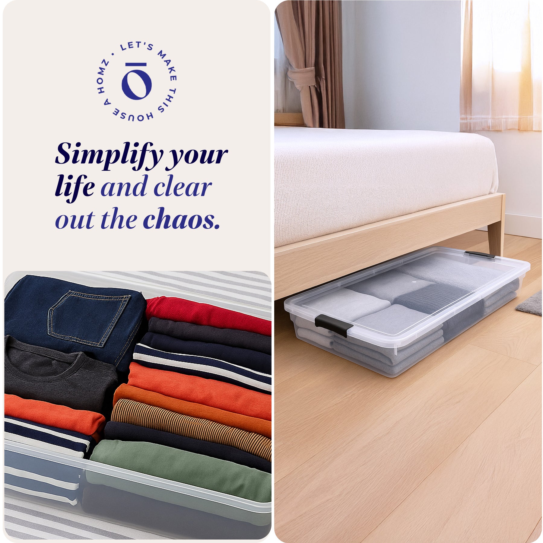 • Set of (2) storage bins with a 60-quart capacity is ideal for storing away shoes, seasonal clothing, crafts, and more