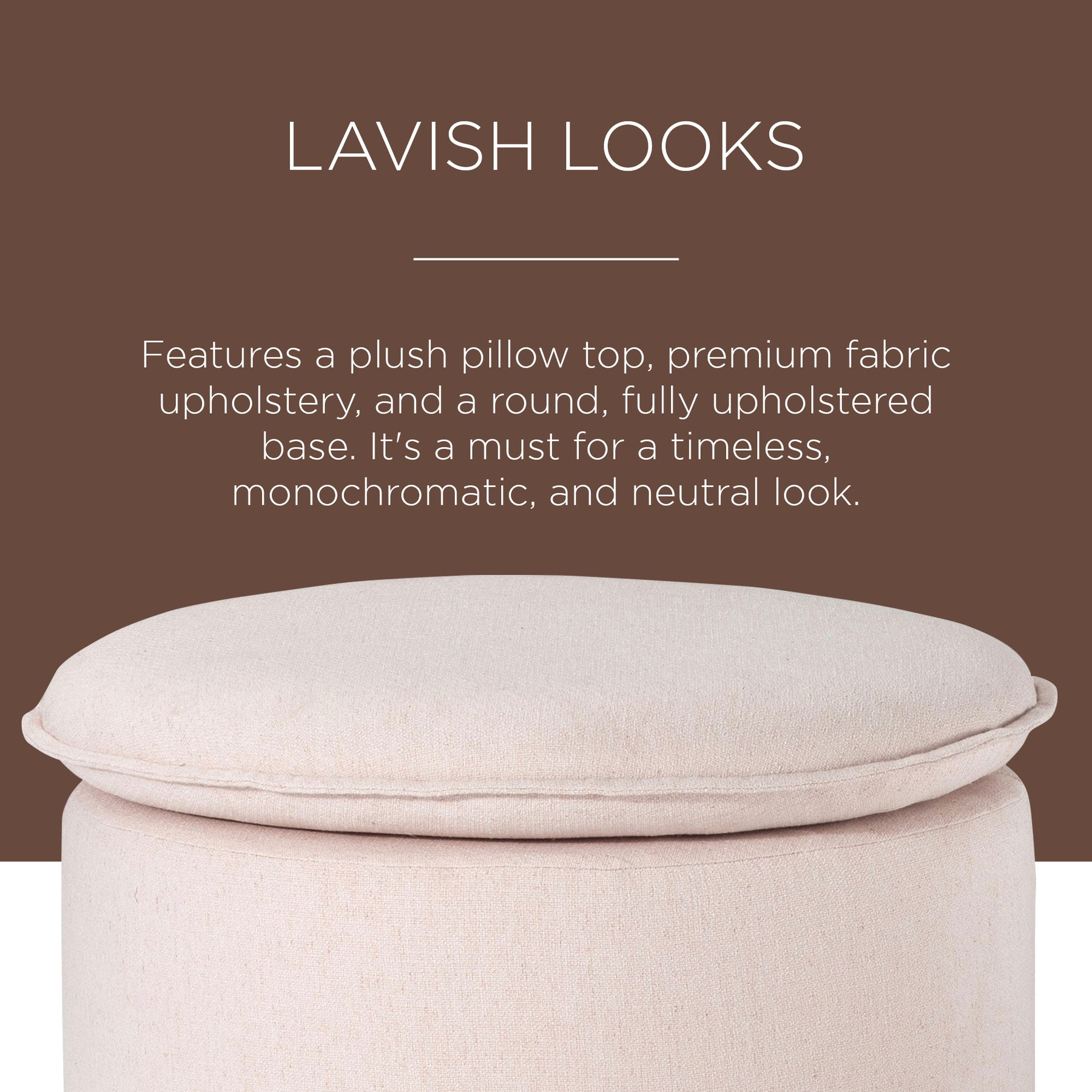 • Pillow-topped and posh with premium fabric upholstery, the Lyra Upholstered Ottoman has an attached pillow top paired with a round, fully upholstered base