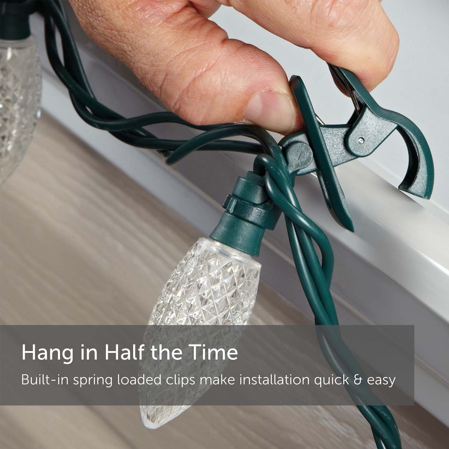 Create a festive and bright atmosphere this holiday season with the Quick Clip String Lights of warm white LED lights. Designed for convenience, the Quick-Clip technology allows you to decorate your home in half the time, eliminating the need for nails and staples. The spring-loaded clips securely attach to rooflines, branches, and railings, while the high-quality C9 bulbs rotate 180 degrees so you can easily adjust each light to your desired position.
