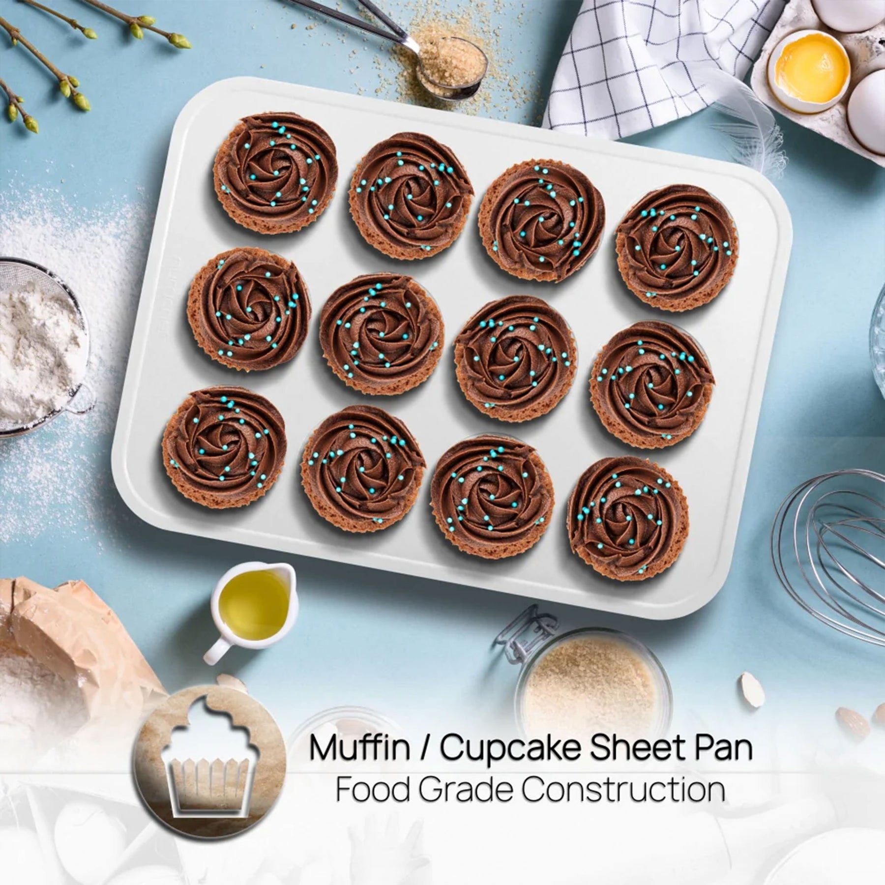 • Includes 1 cookie sheet tray, 1 wide baking pan, 1 square bake pan, 1 oven muffin pan, 1 bread loaf pan, and 1 round cake pan