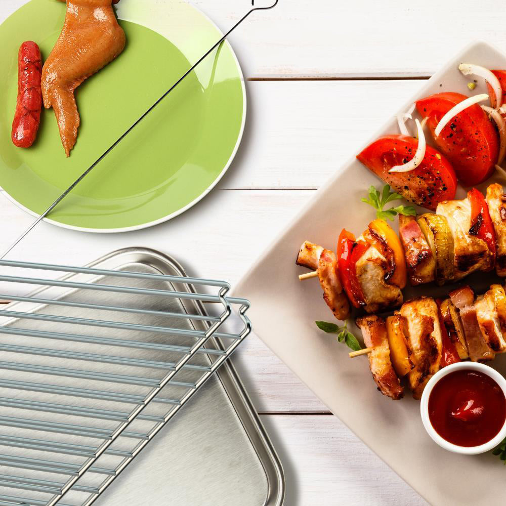 • Includes rotisserie forks and skewers, 1 rotating kebob rack, 2 bake grill racks, 1 bake pan, and 1 drip tray pan to accommodate all purposes