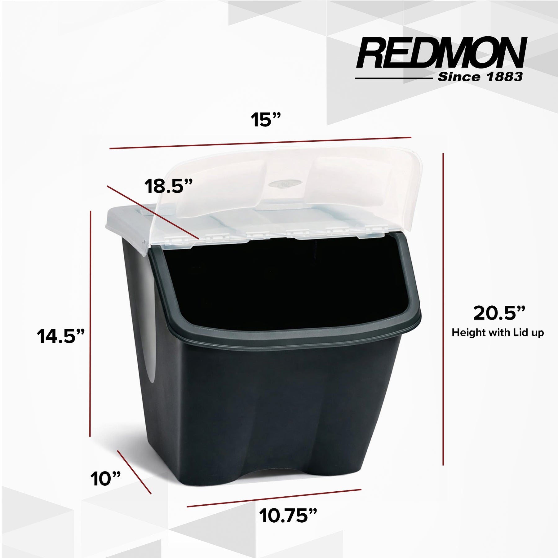 Measuring 15"L x 18.5"W x 4.5"H, the 10-gallon shutter bin offers a functional capacity in a compact footprint. With thoughtfully engineered features and a practical design, Redmon provides a reliable storage solution that helps create a more organized, efficient living space.