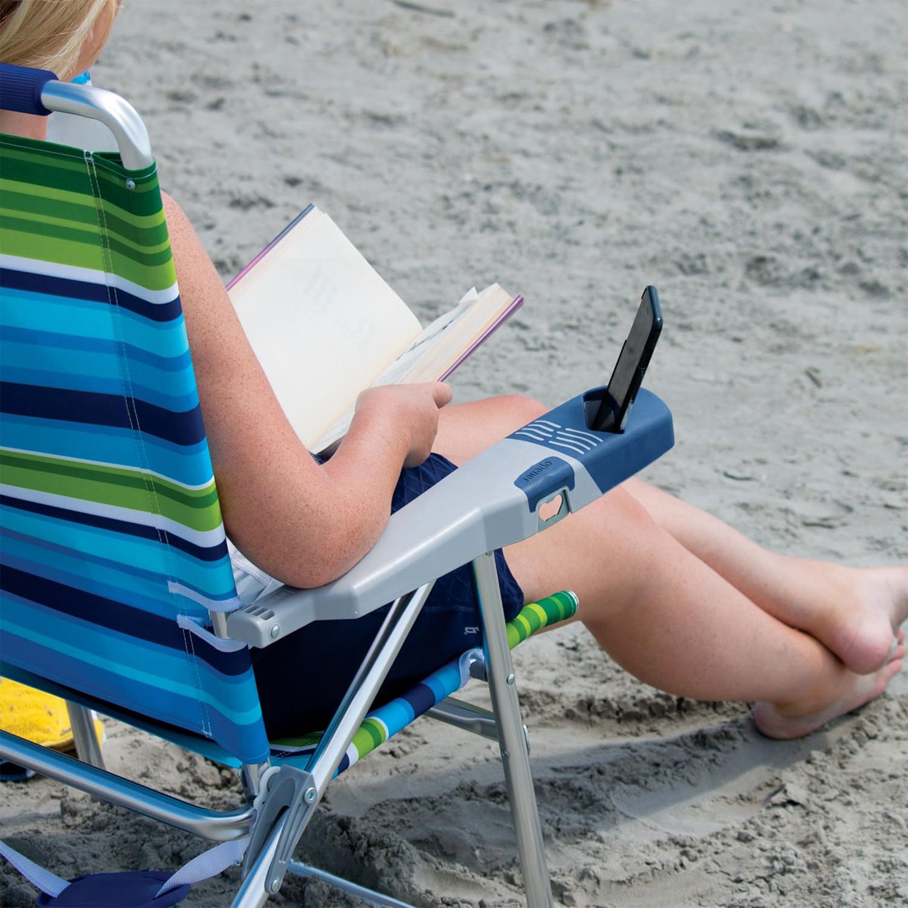 Crafted with double molded arms for sturdy support and added functionality, this folding beach chair showcases innovative features seamlessly integrated into its design. The double fabric backrest presents a pattern from both front and back, ensuring stylish appeal from every angle, while the cushioned headrest and padded carry strap enhance comfort and portability. Experience customizable relaxation with this camping chair's adjustable backrest offering 4 positions and specially designed reclining brackets to prevent pinched fingers. This patio essential features a wide molded arms feature an angled slot for your cell phone and a beverage holder, keeping your essentials within easy reach. Plus, with a convenient bottle opener integrated into the armrest, this tailgating essential becomes a must-have for any outdoor gathering. This outdoor chair offers ample space and support for all your relaxation needs.