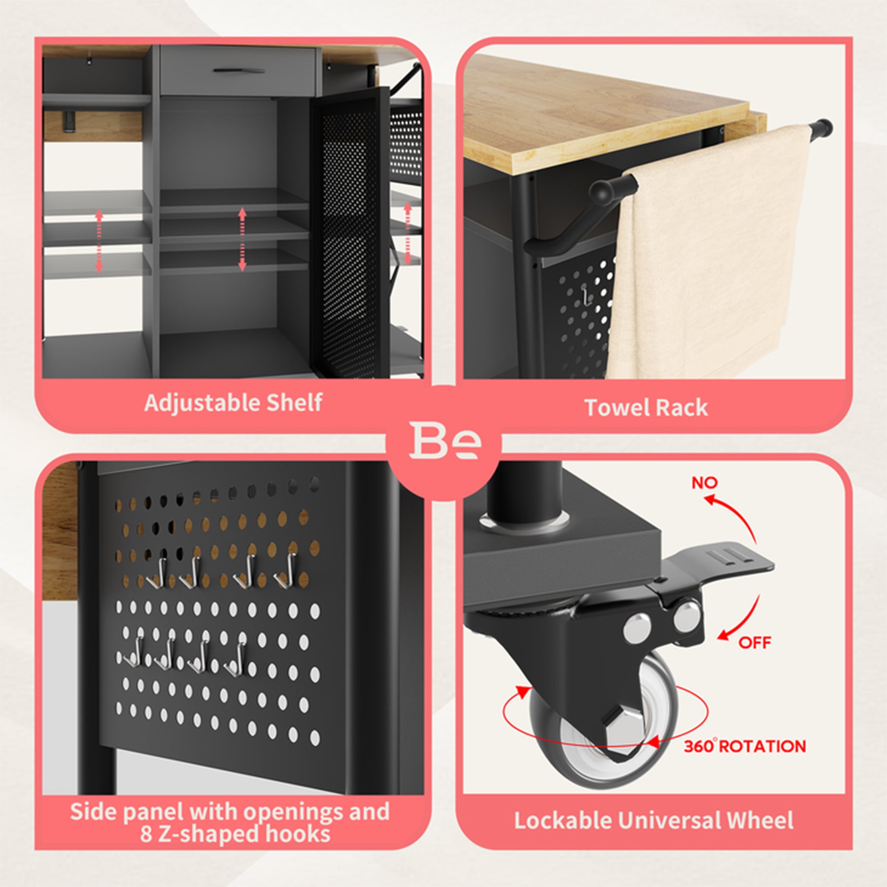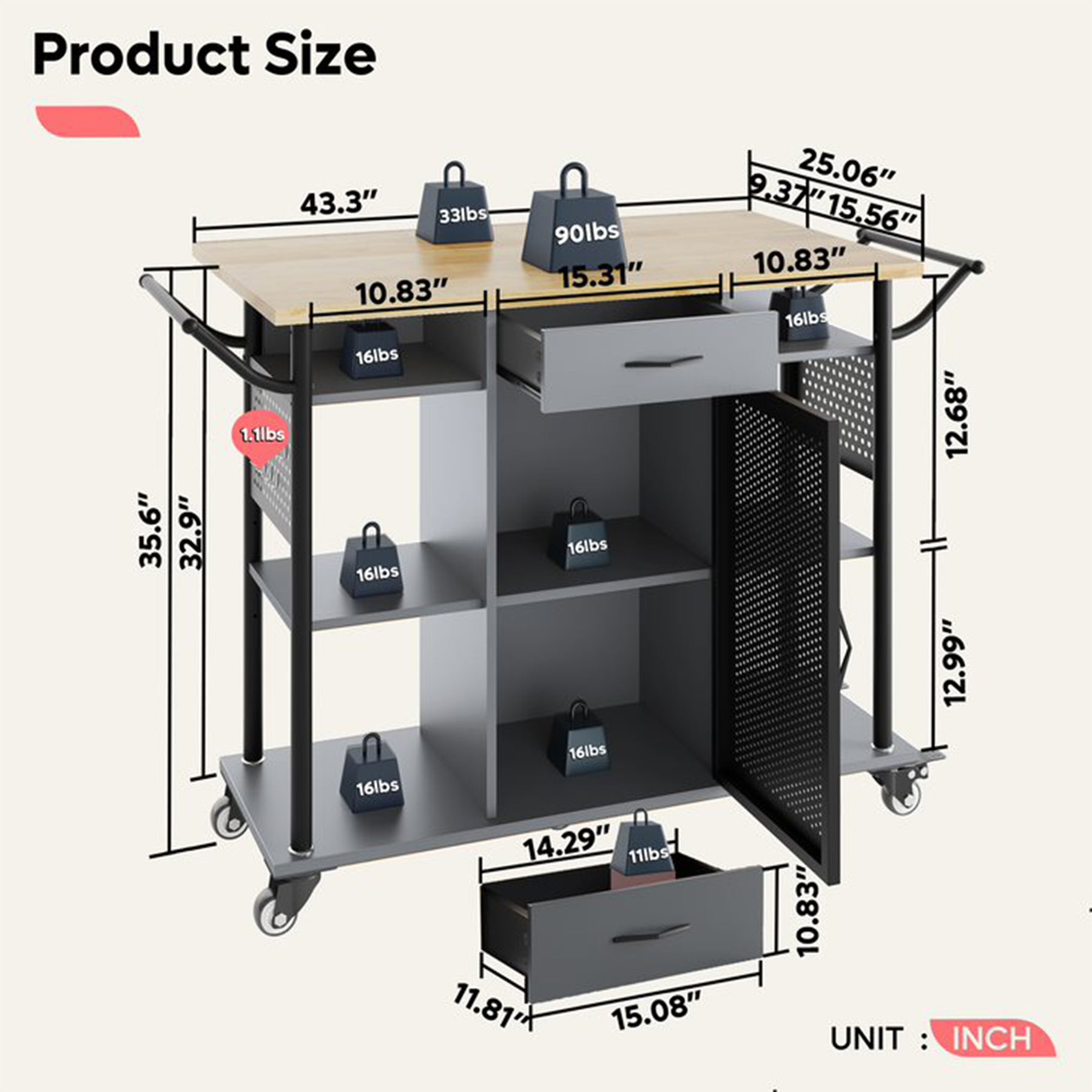 • Includes 6 shelves, 1 cabinet space with 2 additional shelves, 1 drawer, hanging peg holes on each side, and an extendable work surface