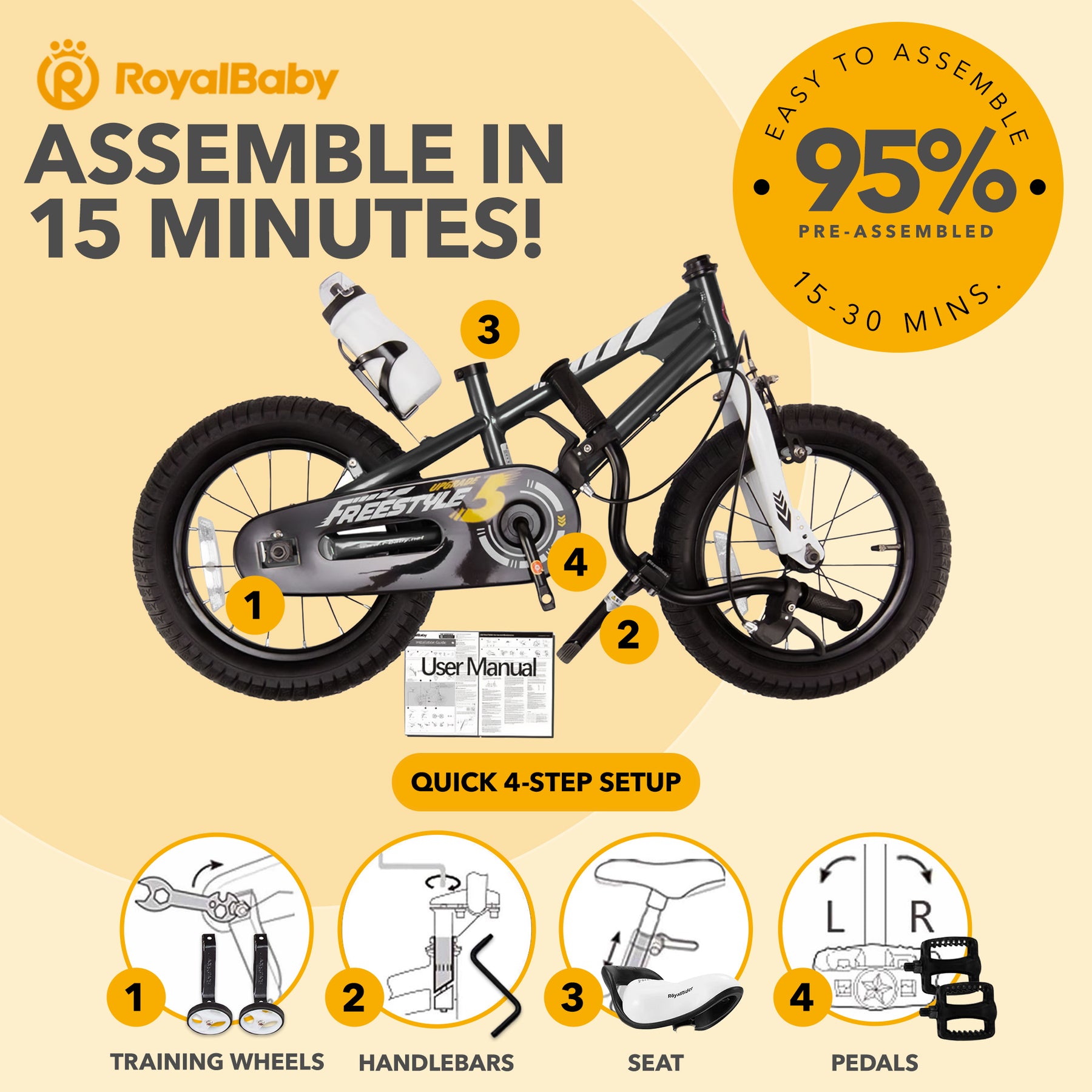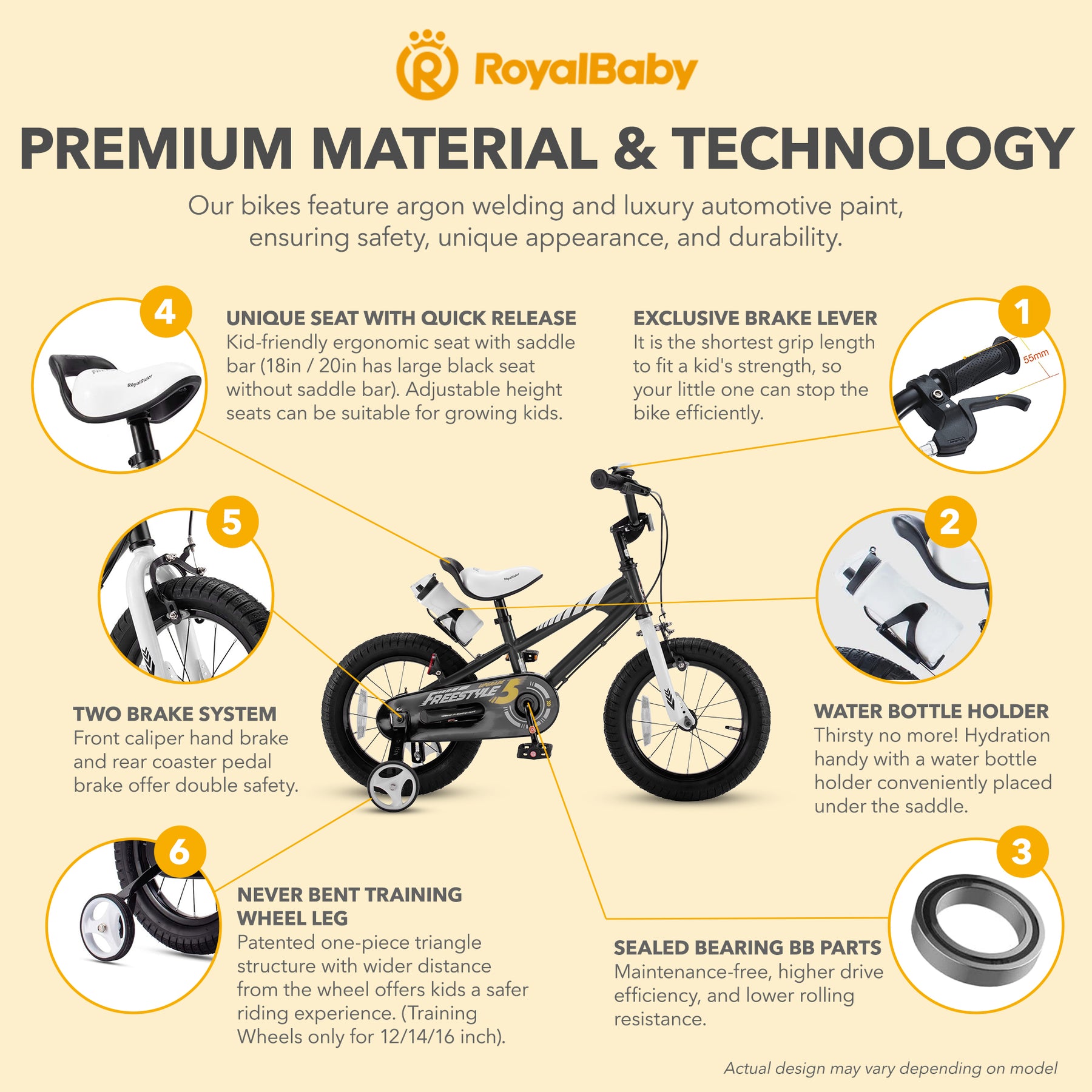 • Equipped with RoyalBaby patented sealed bearing for smooth pedaling while the never-bent training wheels and seat holder help maintain balance while learning to ride