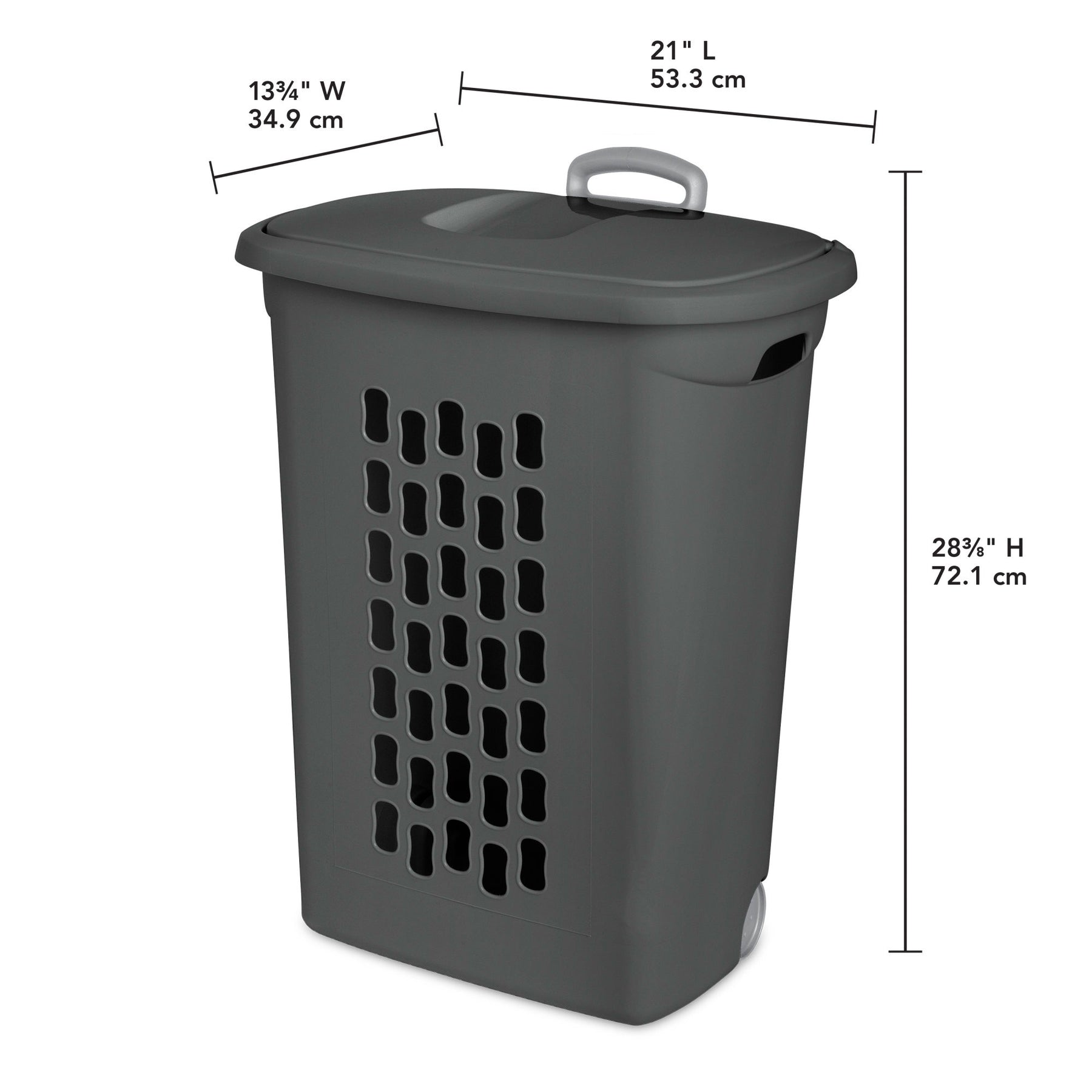 - Wheeled laundry hamper has outside dimensions of 21 inches long, 13.75 inches wide, and 28.38 inches tall