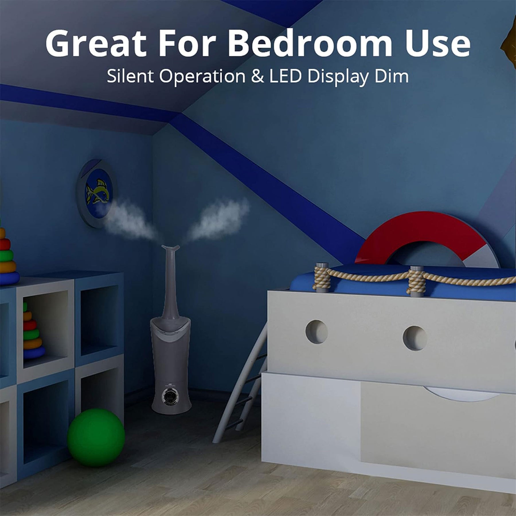 • Programmable humidifier features a timer and 5 mist settings: low, medium, high, supreme, and turbo