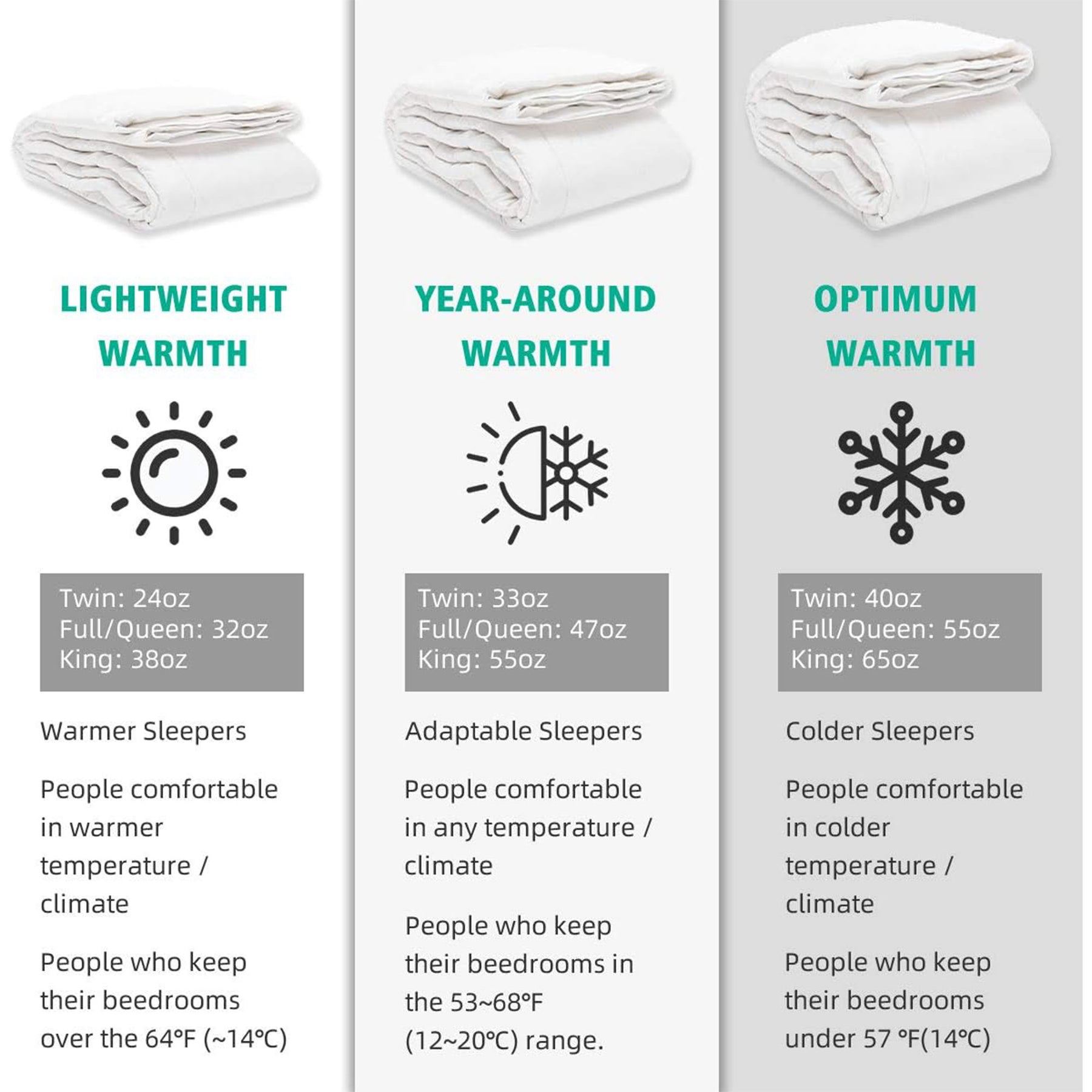 • Experience the perfect balance of warmth and weight with our lightweight feather down comforter, designed for a medium warmth level without any sense of compression
