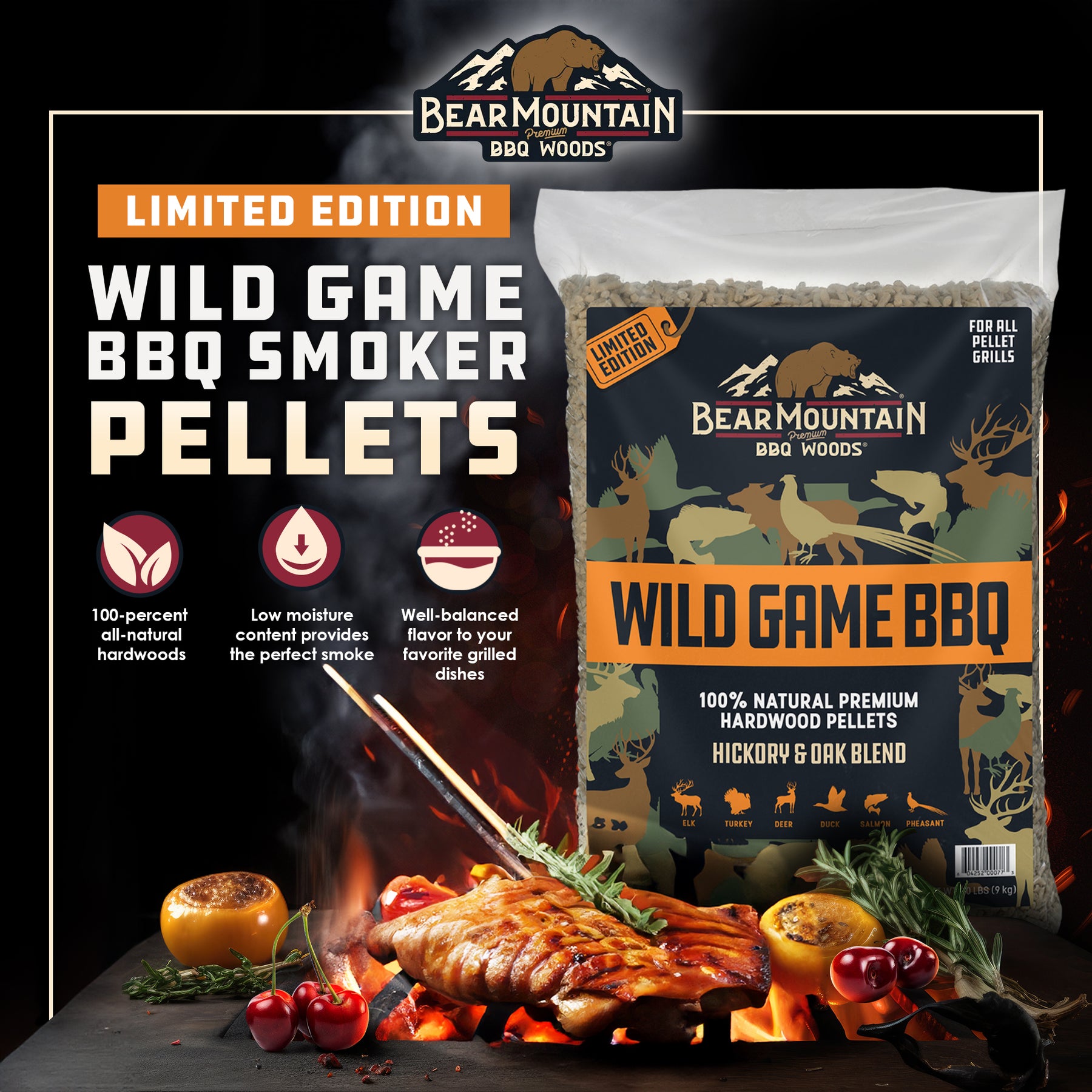 - Wild Game BBQ blend of hickory and oak infuses a sweet, smoky flavor into turkey, lamb, pork, beef, veggies, and desserts