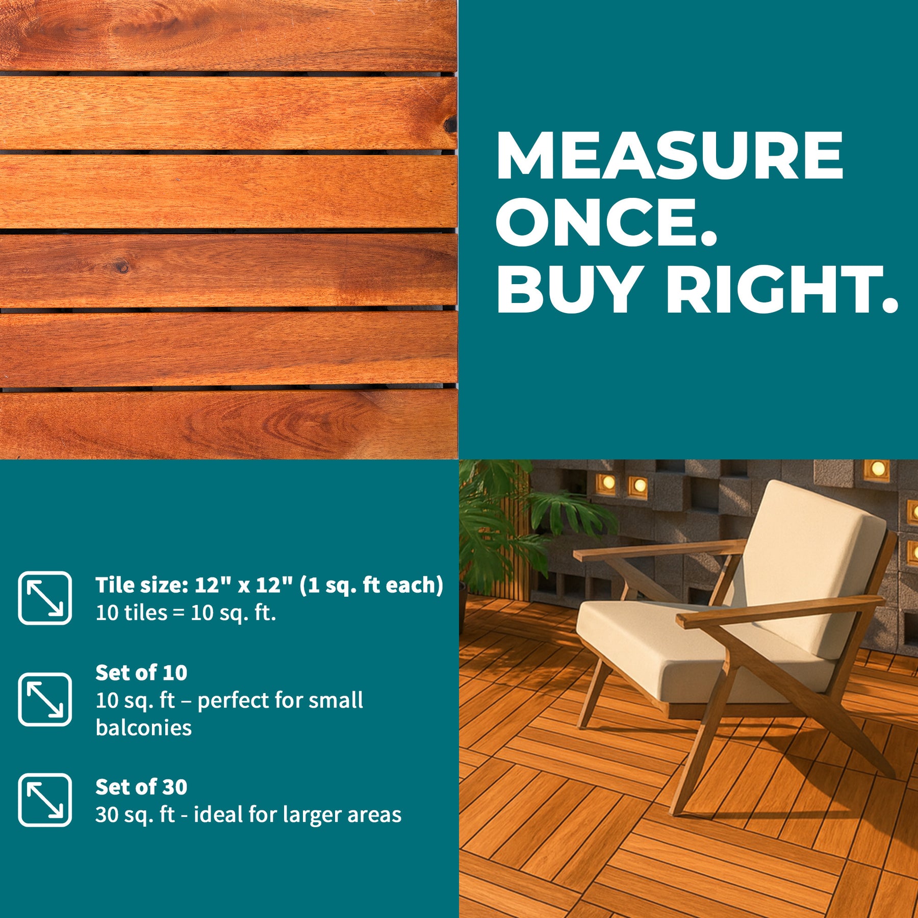 • Wooden tiles are FSC-certified, responsibly sourced from acacia wood providing lasting performance