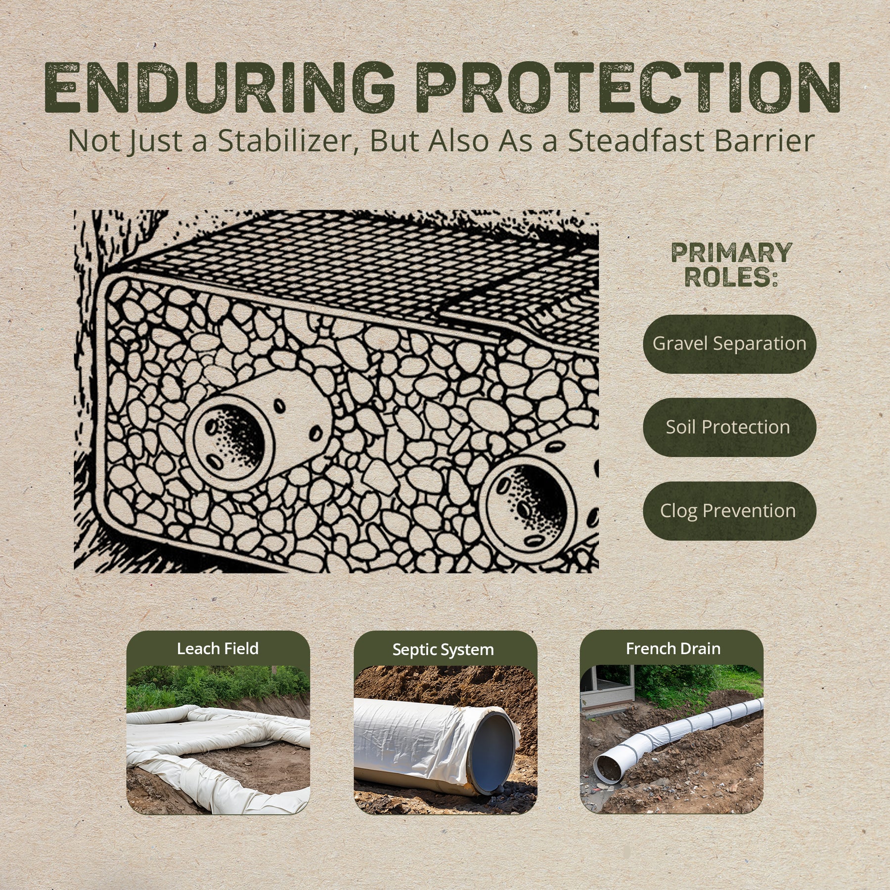 • Septic filter fabric designed to separate gravel and soil backfill, ensuring optimal drainage performance and preventing system clogging
