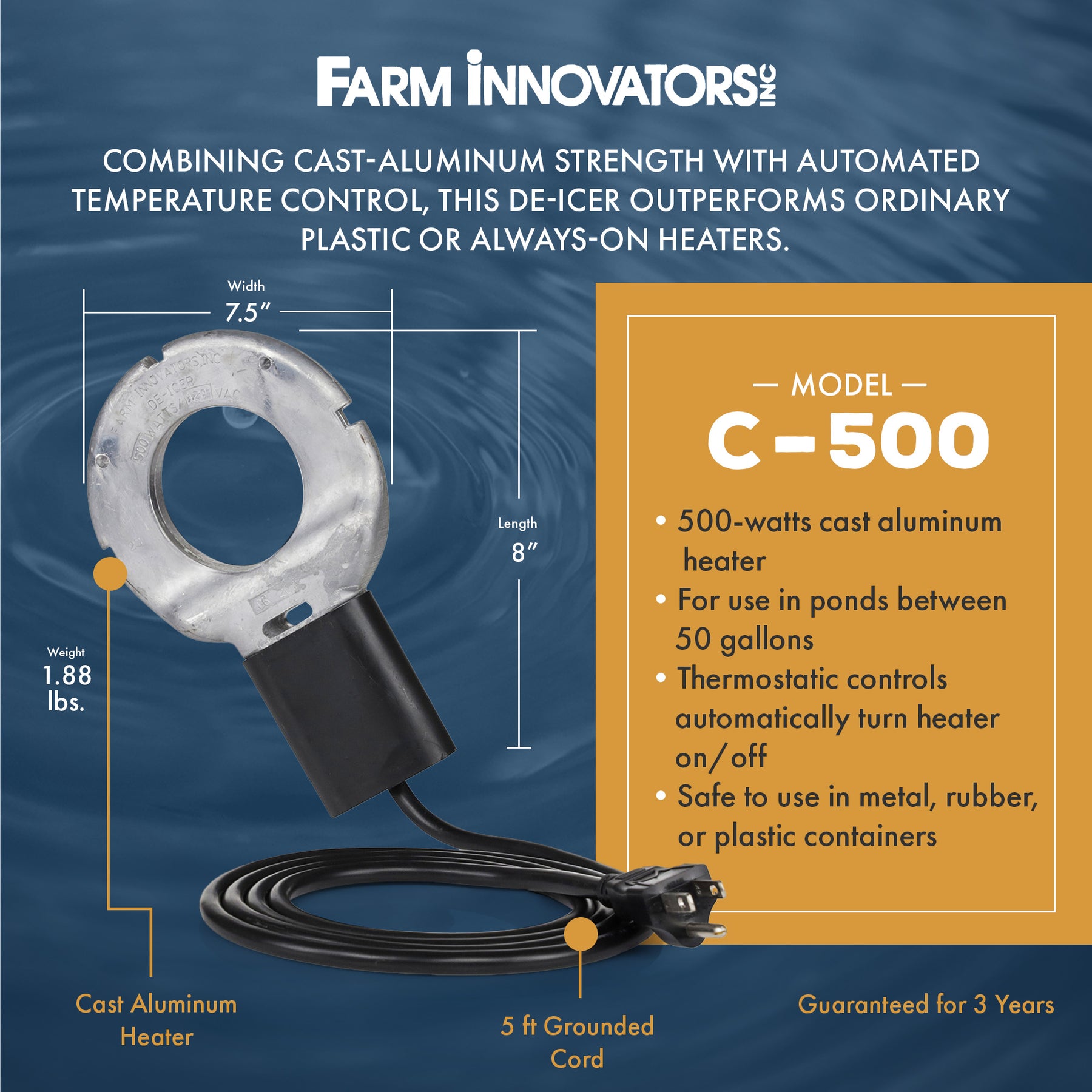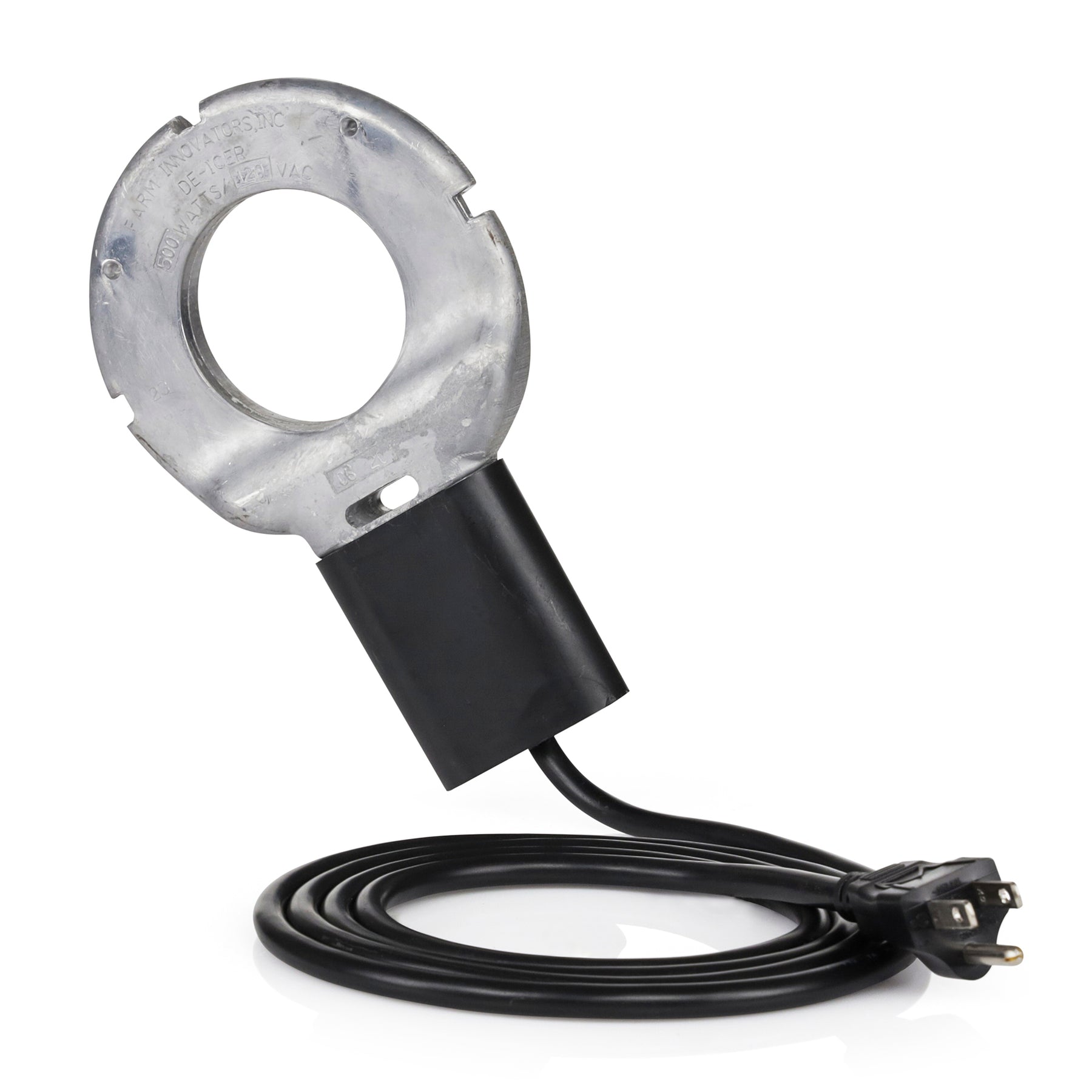 • Submergible cast aluminum utility de-icer allows you to keep cattle's water from freezing and other versatile uses around the farm