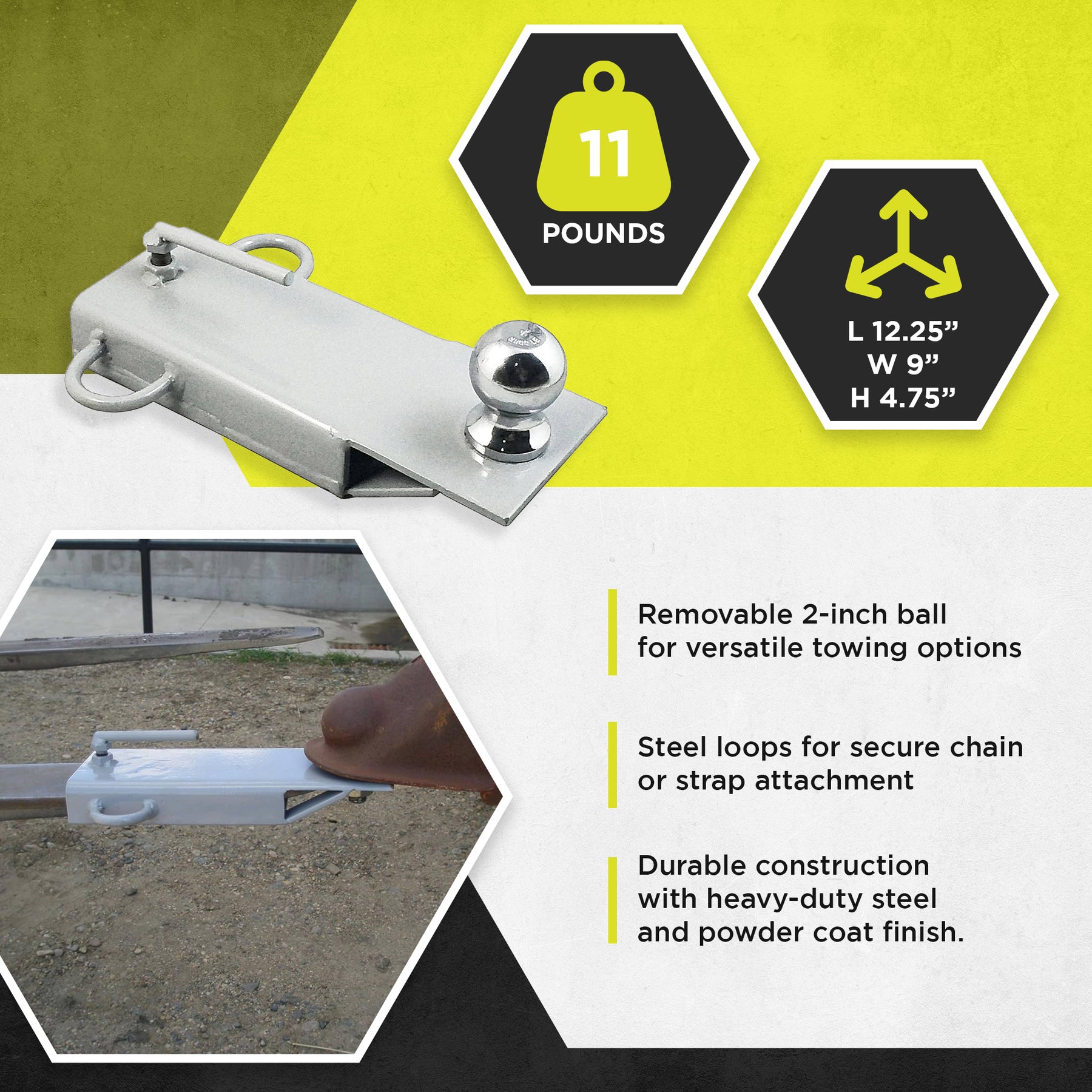 • Ball mount attachment that ensures effortless equipment hauling and fits over a wide variety of forks up to 5 inches, ensuring compatibility with skid loaders, forklifts, and tractors, making it a versatile addition to any equipment fleet