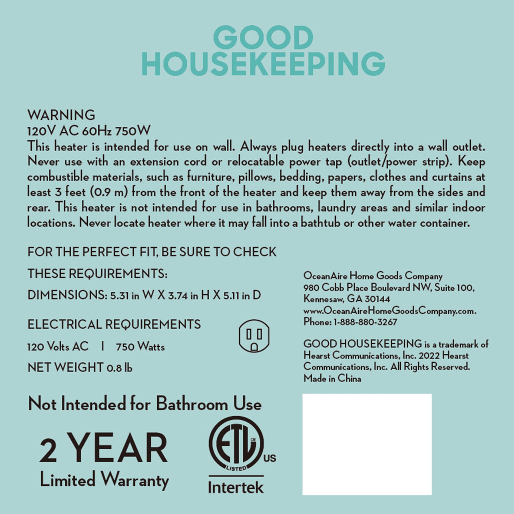Good Housekeeping Wall-Mount Mini Space Heater w/Thermostat,750W,White(Open Box)