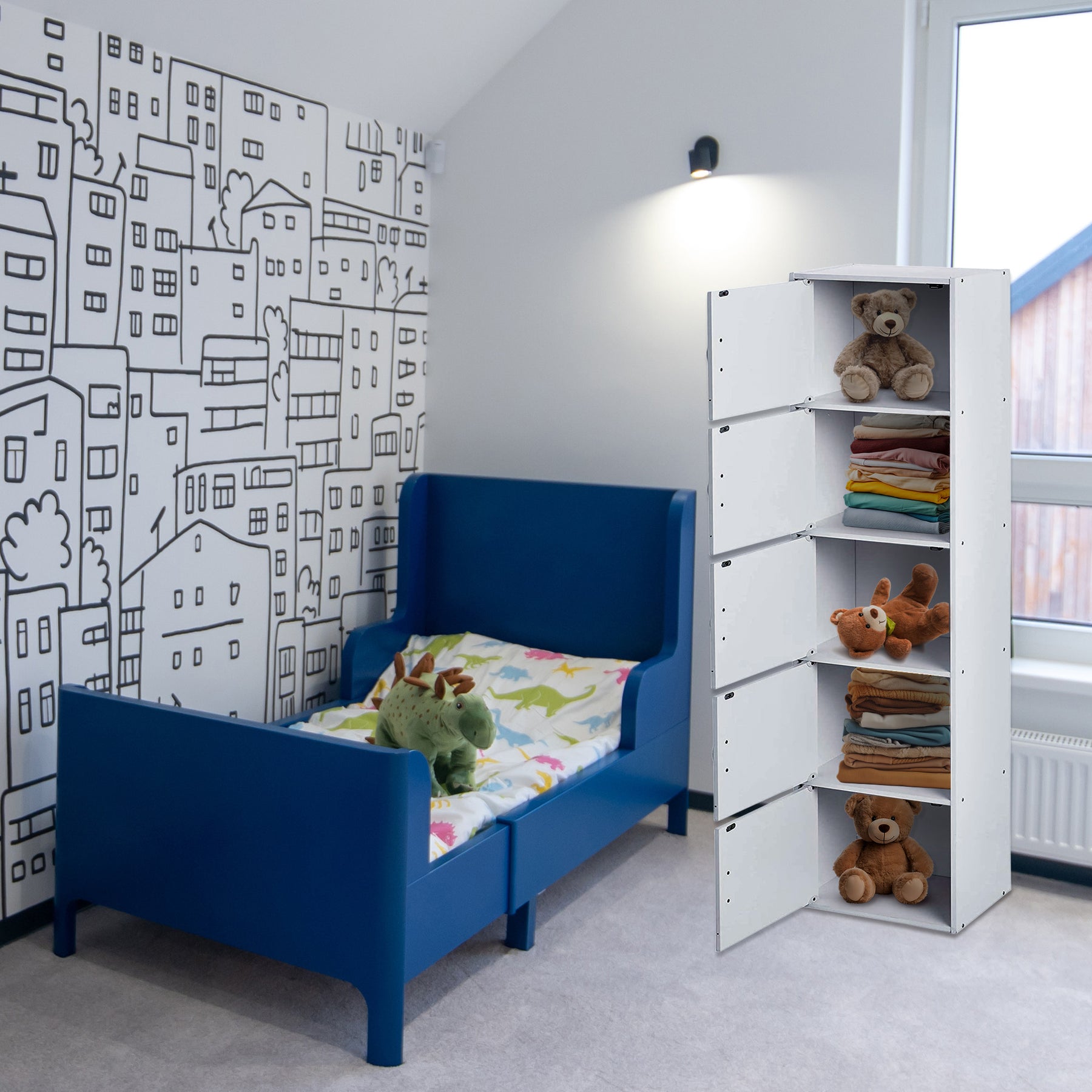 • Multi-purpose unit has 5 shelves with 5 doors to store books, clothes, toys, office supplies, and more