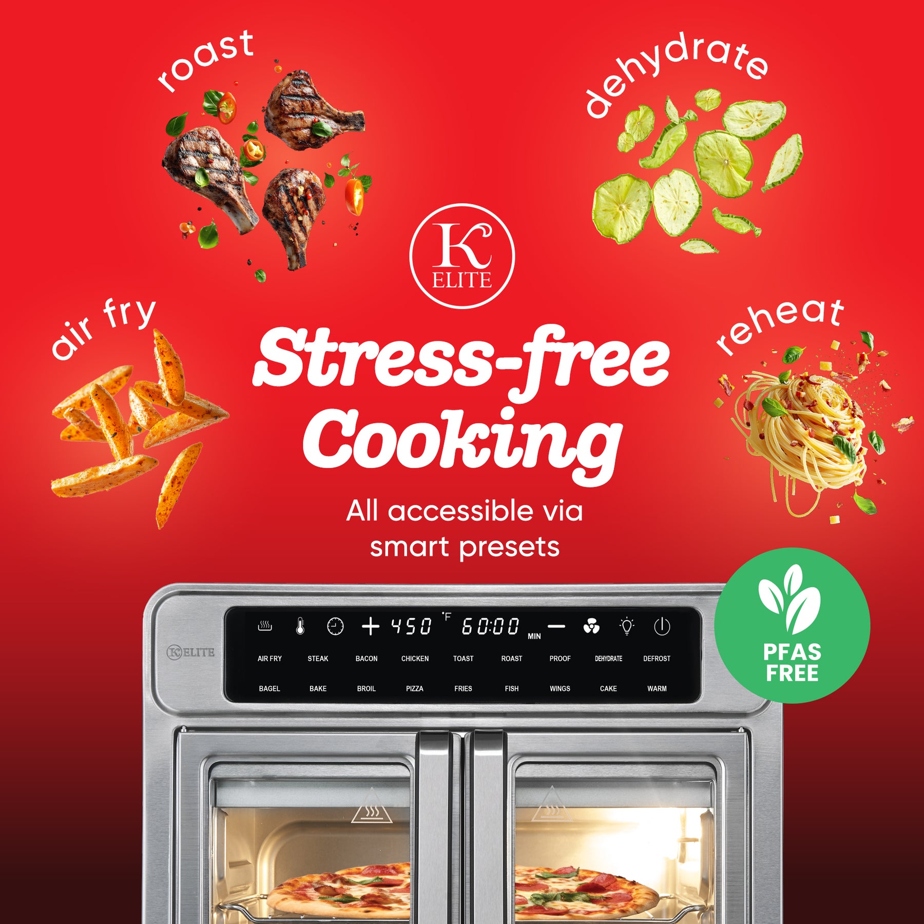 • Multi-cooking functions include air fry, bake, broil, roast, toast, dehydrate, defrost, proof dough, and more