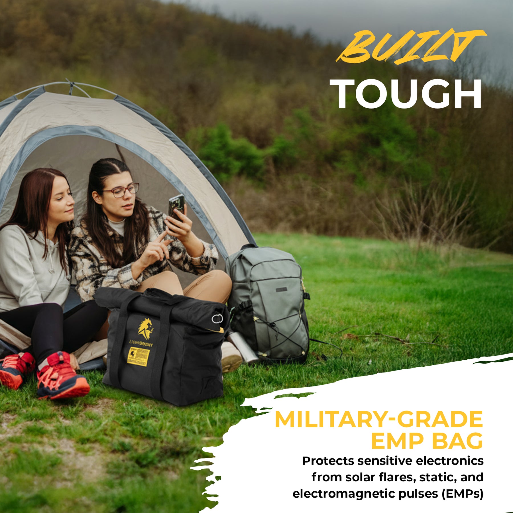 • Military-grade EMP bag protects sensitive electronics from solar flares, static, and electromagnetic pulses (EMPs)