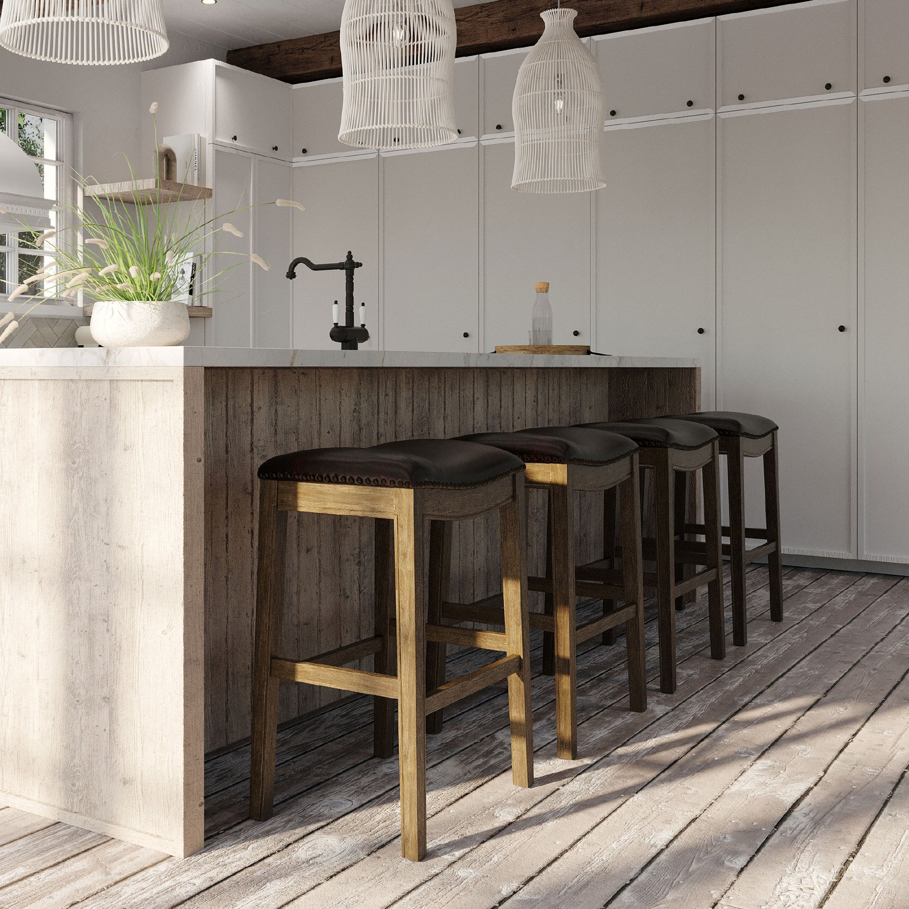 • A timeless masterpiece crafted with vegan leather, our Adrien backless saddle stool blends sophistication and coziness with premium PU leather upholstery, nailhead trim, and multiple wood-finish options