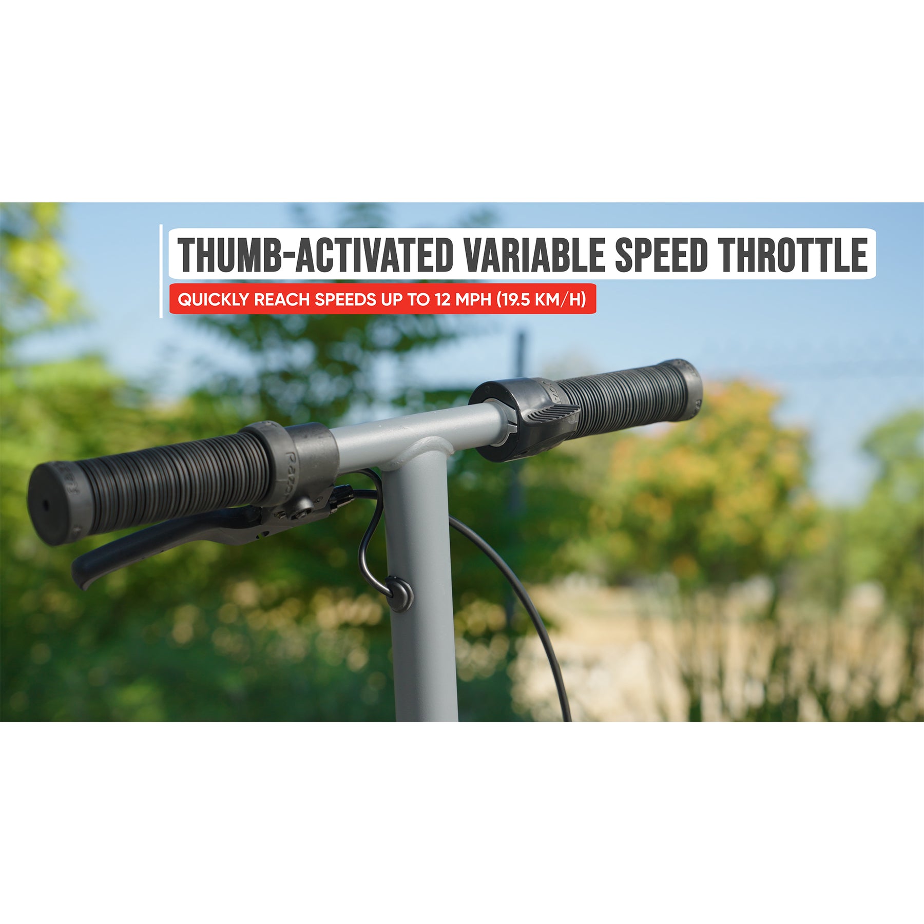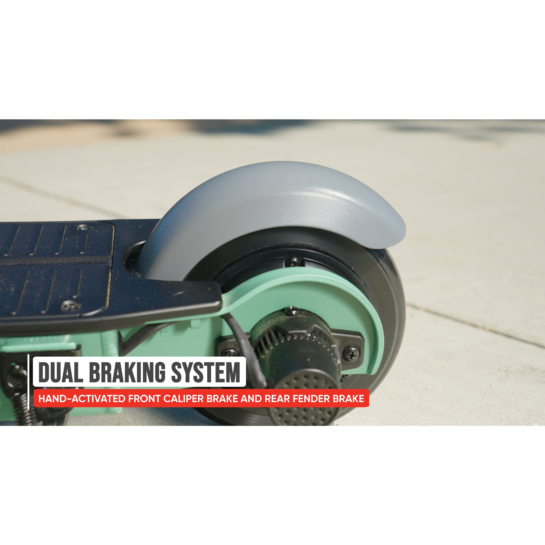 • Electric scooter powered by 150-watt hub motor for speeds up to 12 miles per hour