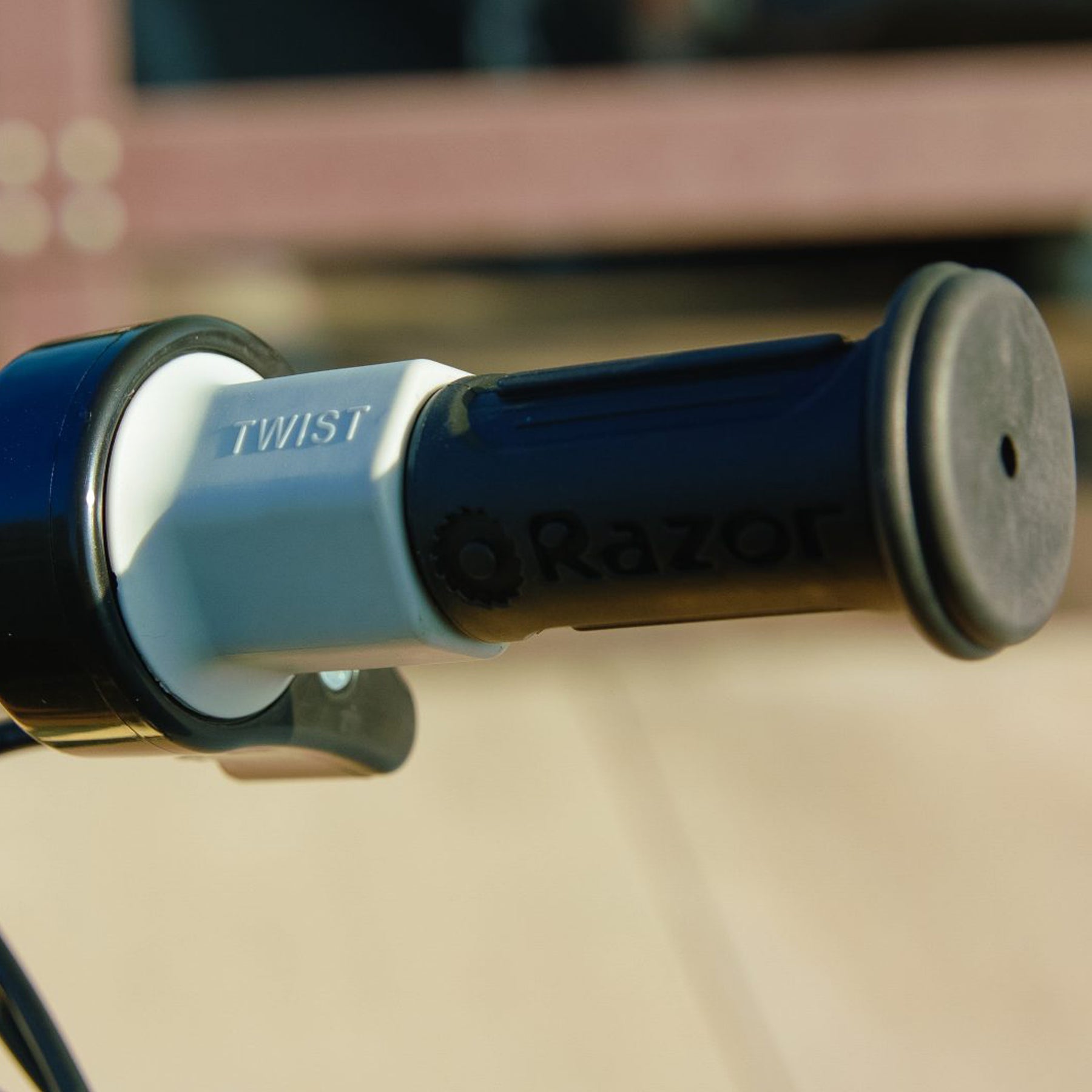• Twist grip acceleration control, Hand operated rear brake, Super-sized deck, Retractable kickstand