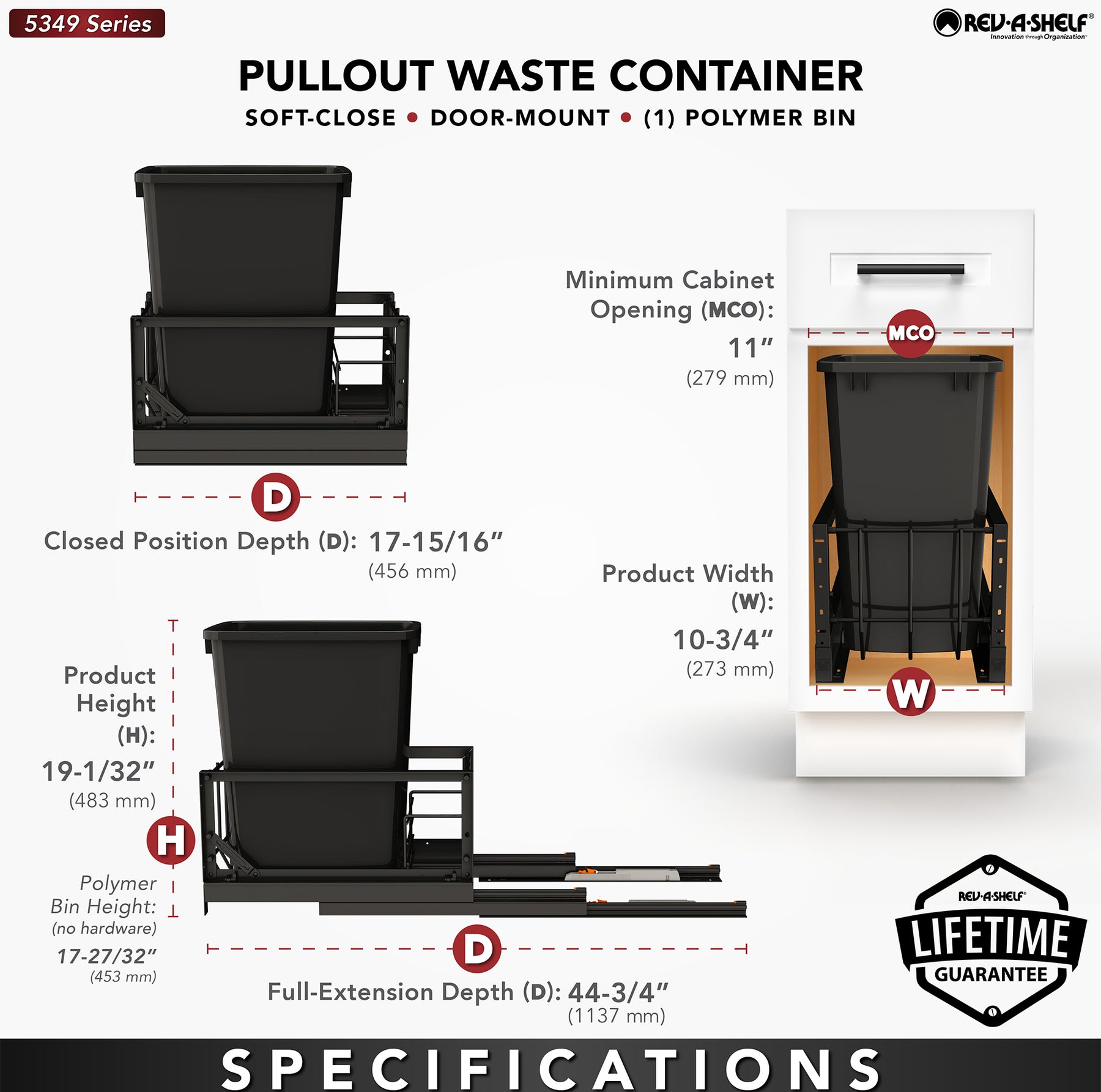 - Waste Container bin included; Optional Rev-A-Shelf lids and door-mount extenders for wider door are available, sold separately