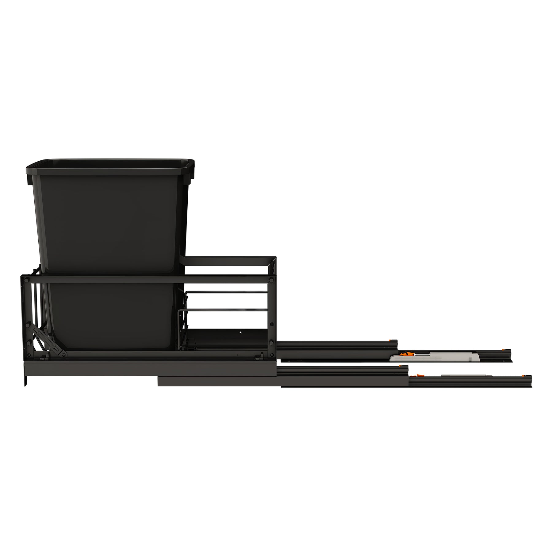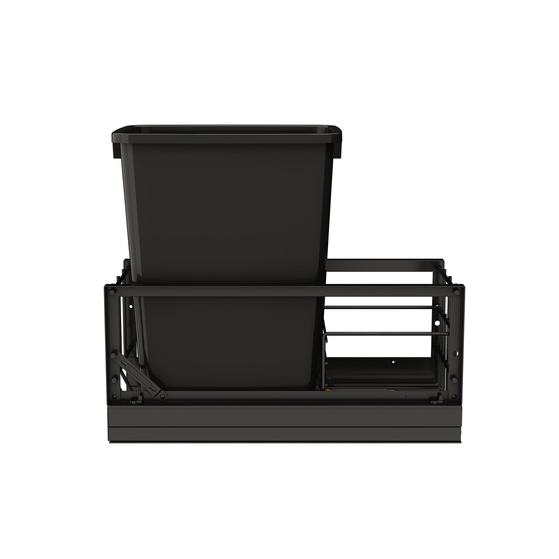 - Aluminum Pullout Single Waste Container with Soft-Close to keep kitchen trash and recycling discreetly hidden yet easily accessible