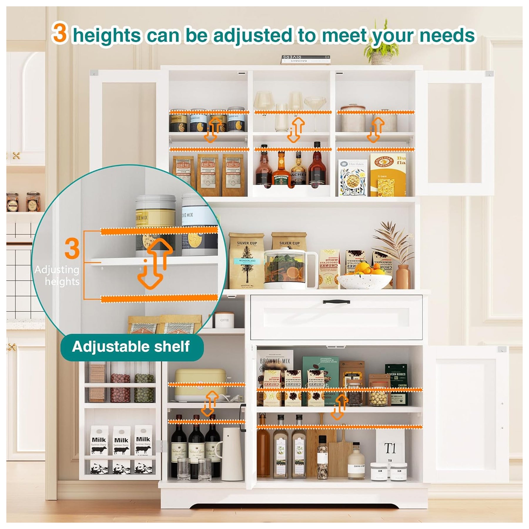 • 68-inch tall pantry cabinet with hutch, large drawer, and multiple adjustable shelves for flexible storage