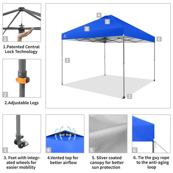 - 10x10-foot pop-up canopy tent features patented one-push center lock tech that locks the poles in place for simple setup