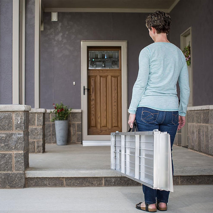 Crafted from lightweight aluminum, this ramp offers a hassle-free user experience. With ergonomically designed handles, your transport worries is a thing of the past. These handles are not only comfortable but also non-breakable, ensuring your portable ramp stays with you, wherever you venture. For added strength and stability, it also features a continuous, low-profile hinge that spans the full length of the ramp. No pinching, no wobbling, just reliable support for your mobility device. With guaranteed exceptional traction, this ramp boasts an extruded tread that resists slips. This feature offers unparalleled grip in all weather conditions. With self-adjusting bottom transition plates, you can transition seamlessly from the ramp to different terrains. Whether it's a rugged outdoor path or a smooth indoor surface, this ramp effortlessly keeps up with your mobility needs.