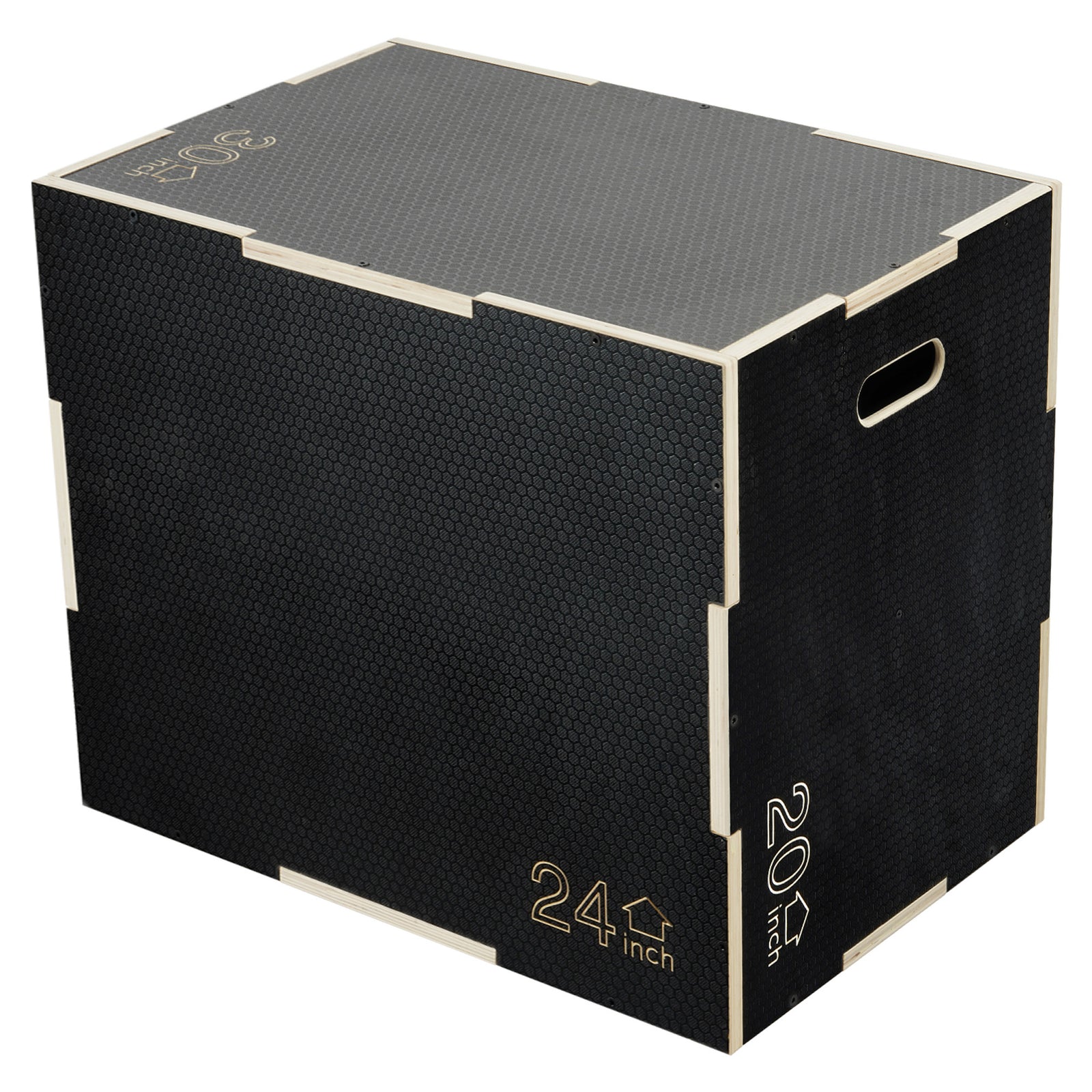 Designed for fitness enthusiasts of all levels, this versatile plyometric box offers a range of exercises to boost your agility, strength, and endurance. Crafted from high-quality wood, this workout accessory ensures durability and stability, making it a reliable companion for your workout routines. The non-slip surface provides a secure platform, allowing you to perform jumps, step-ups, and other exercises confidently. With 3 different height options (30-inch, 24-inch, and 20-inch) in one box, you can customize your workouts to match your fitness level and goals whether training for sports, improving your cardiovascular health, or enhancing your overall fitness, this plyo box is designed to meet your needs.