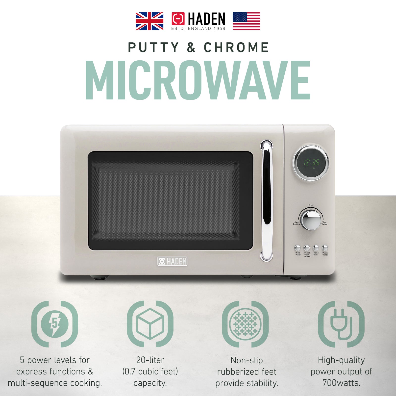 Haden 700 Watt Microwave Oven w/Digital Controls, Putty/Chrome (Open Box)